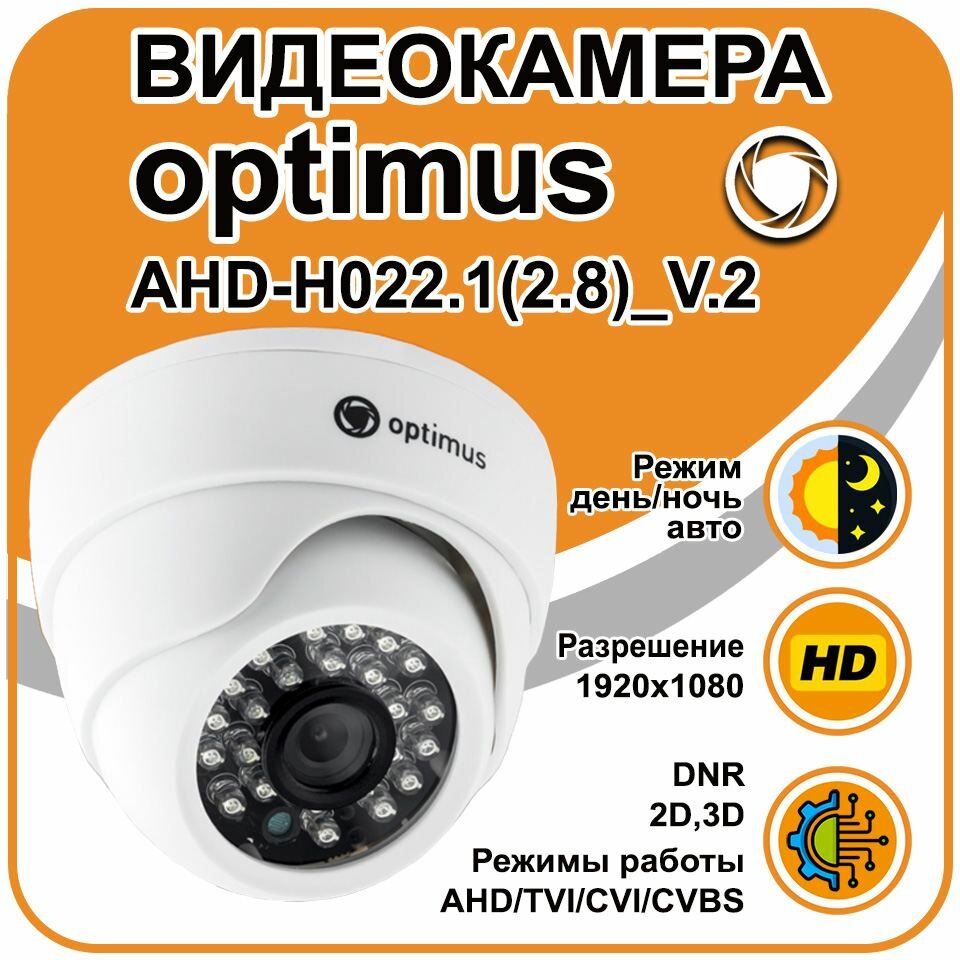 Видеокамера Optimus AHD-H022.1(2.8) V.2 купольная, 1/2.9", ИК 20м, 2.1MП(1080P), 2.8мм