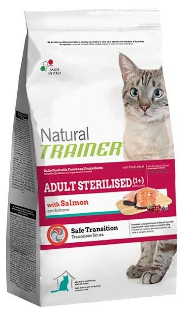 TRAINER NATURAL ADULT CAT STERILISED WITH SALMON & PEA FIBRE для взрослых кастрированных котов и стерилизованных кошек с лососем и клетчаткой гороха (10 кг)