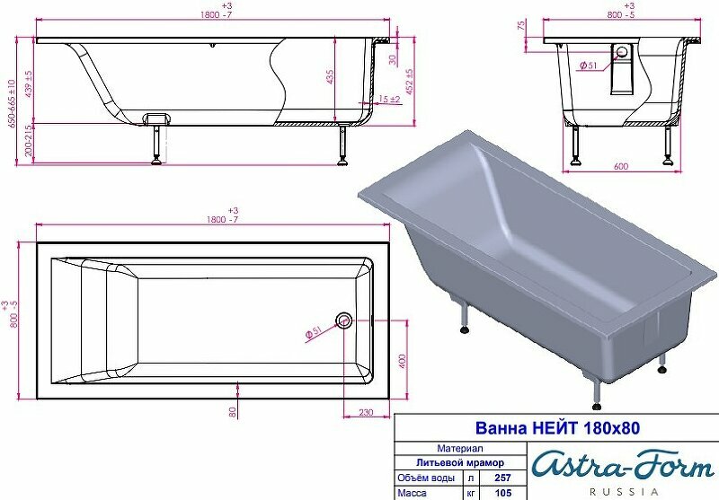Ванна из литьевого мрамора Astra-Form Нейт 180 х 80 с ножками (Ванна из литьевого мрамора Astra-Form Нейт 180 х 80)