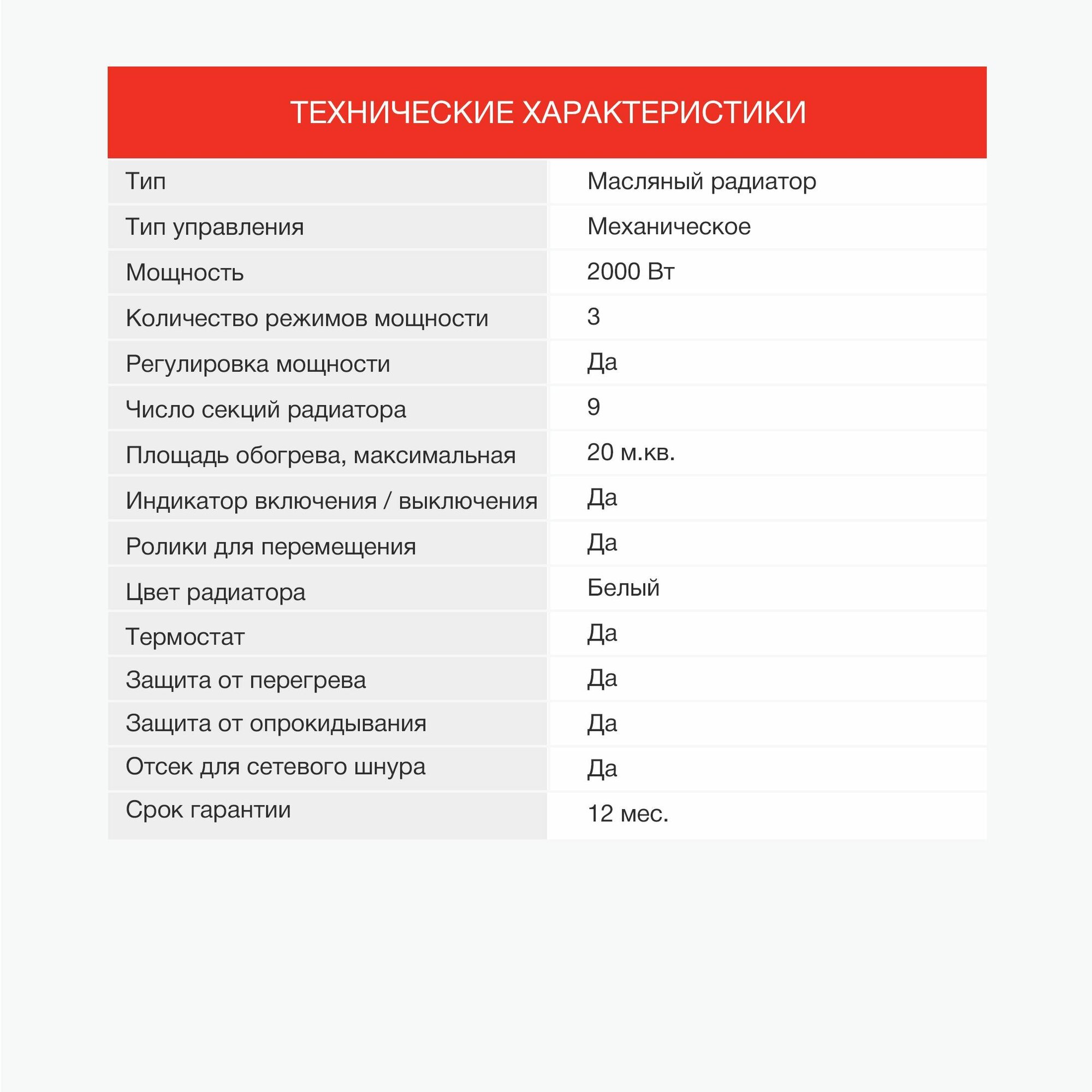 Volteno Масляный радиатор StarWind SHV3915, с терморегулятором, 2000Вт, 9 секций, 3 режима, белый масляные радиаторы в Курчатов