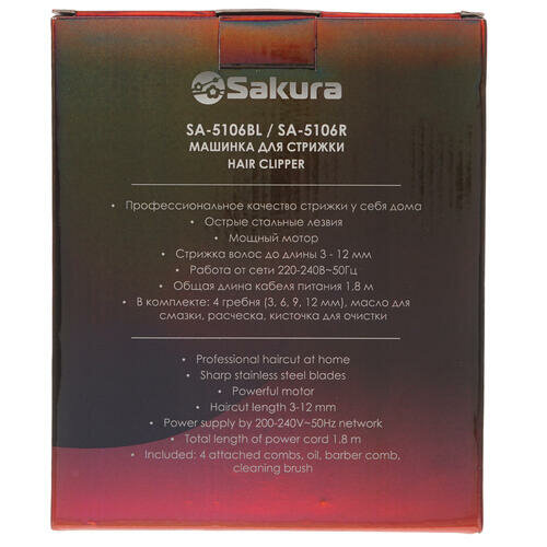 Машинка д/стрижки SAKURA SA-5106 R (7 Вт, 4 нас, нерж.нож), (24)