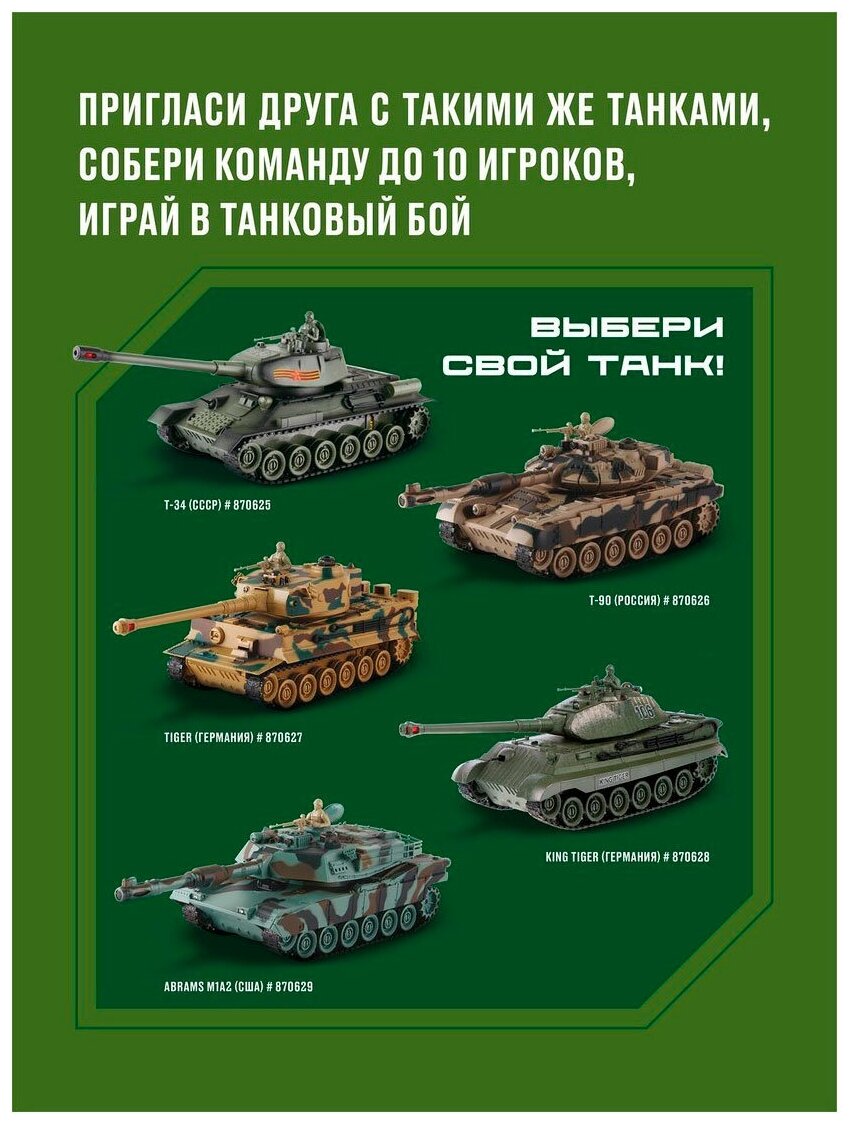 Цена для г. Курчатов. Р/у модель танка KING TIGER (Германия) с реалистичными светозвуковыми эффектами при стрельбе и визуальными эффектами (отдача при выстреле). Танк осуществляет движение вперёд/назад, повороты вправо/влево, подъёмы под углом 45°, круговое вращение на месте и поворот башни вправо-влево на 320°. В игрушке предусмотрены демонстрационный режим и автоотключение. Танк оснащён функцией боя. Магазины в городе Курчатов смотрите ниже
