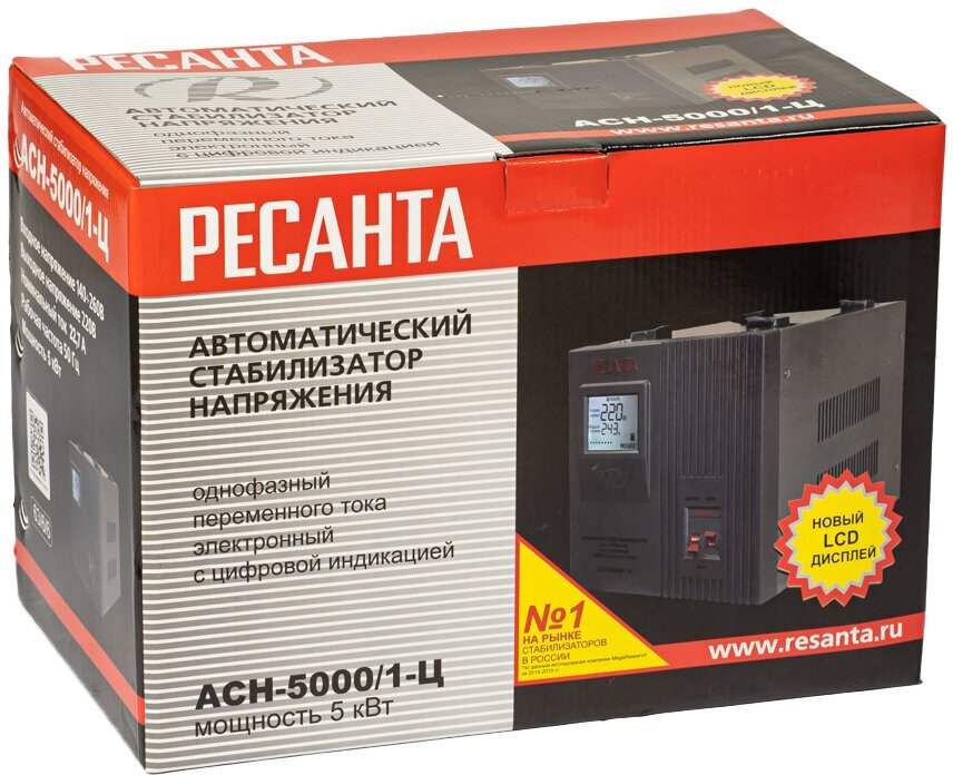 Стабилизатор напряжения однофазный РЕСАНТА АСН-5 000/1-Ц ( 5кВт; входное напряжение 140-260 В; 26,3А; LCD-дисплей, клеммы)