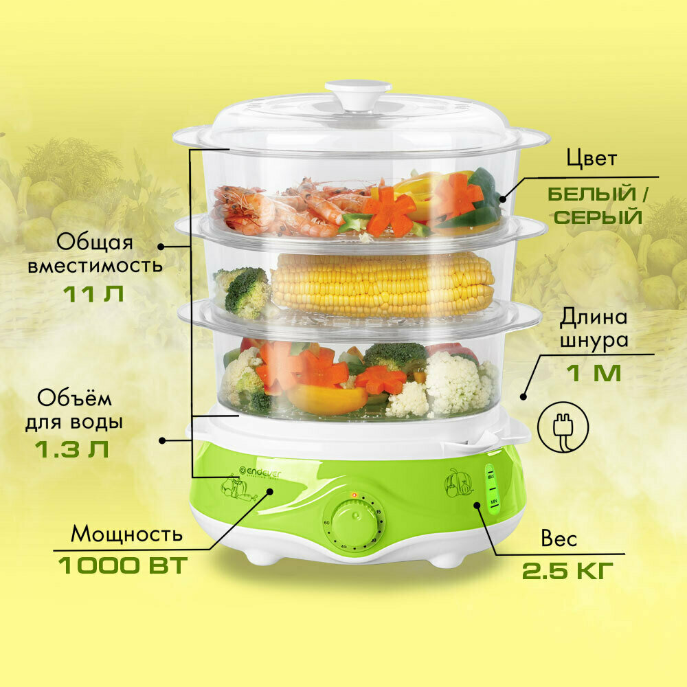 Пароварка Endever Vita-171 11л. 1000 Вт. 3 паровые корзины, белый/зеленый