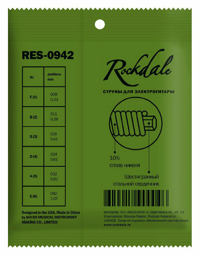 Цена для г. Курчатов. ROCKDALE RES-0942 Струны для электрогитары с шестигранным сердечником и никелевым покрытием. Цветная бобышка в основании струны соответствует определенному номеру струны. Размер: 009-042. Магазины в городе Курчатов смотрите ниже