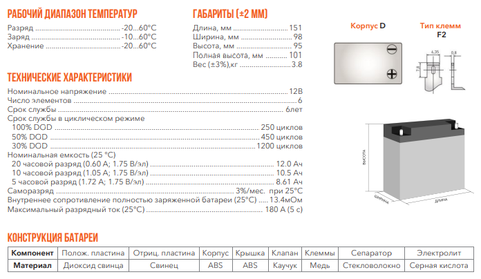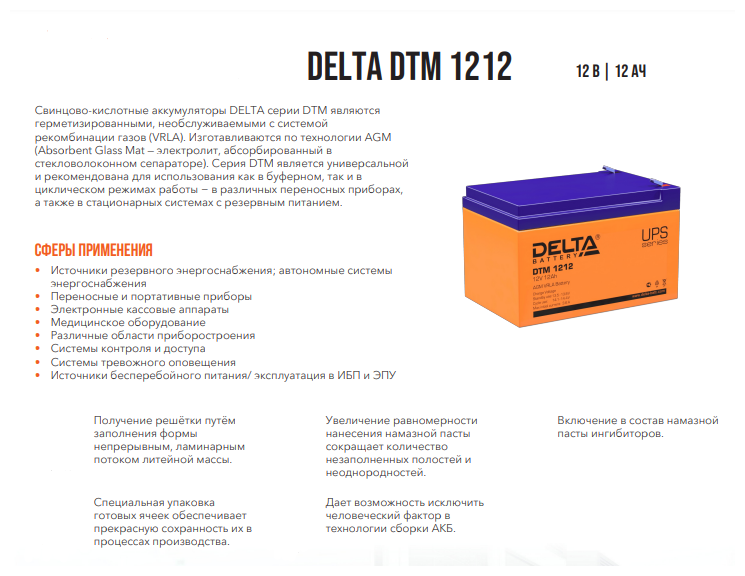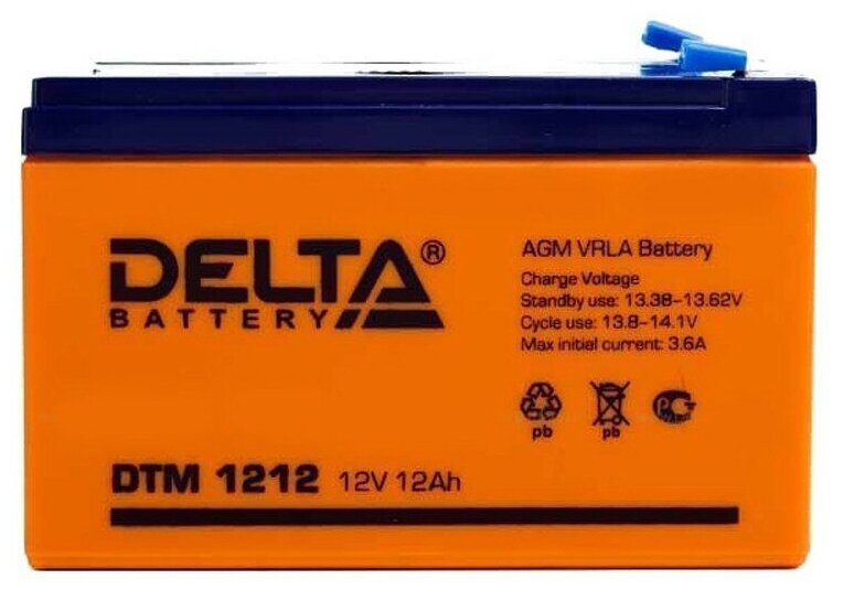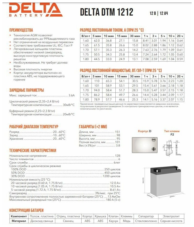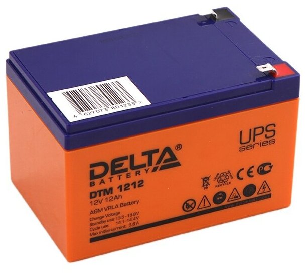 Батарея DELTA серия DTM, DTM 1212, напряжение 12В, емкость 12Ач (разряд 20 часов), макс. ток разряда (5 сек.) 180А, макс. ток заряда 3.6А, свинцово-кислотная типа AGM, клеммы F2, ДxШxВ 151х98х95мм., вес 3.8кг., срок службы 6 лет. Delta UPS DTM 1212 (12V