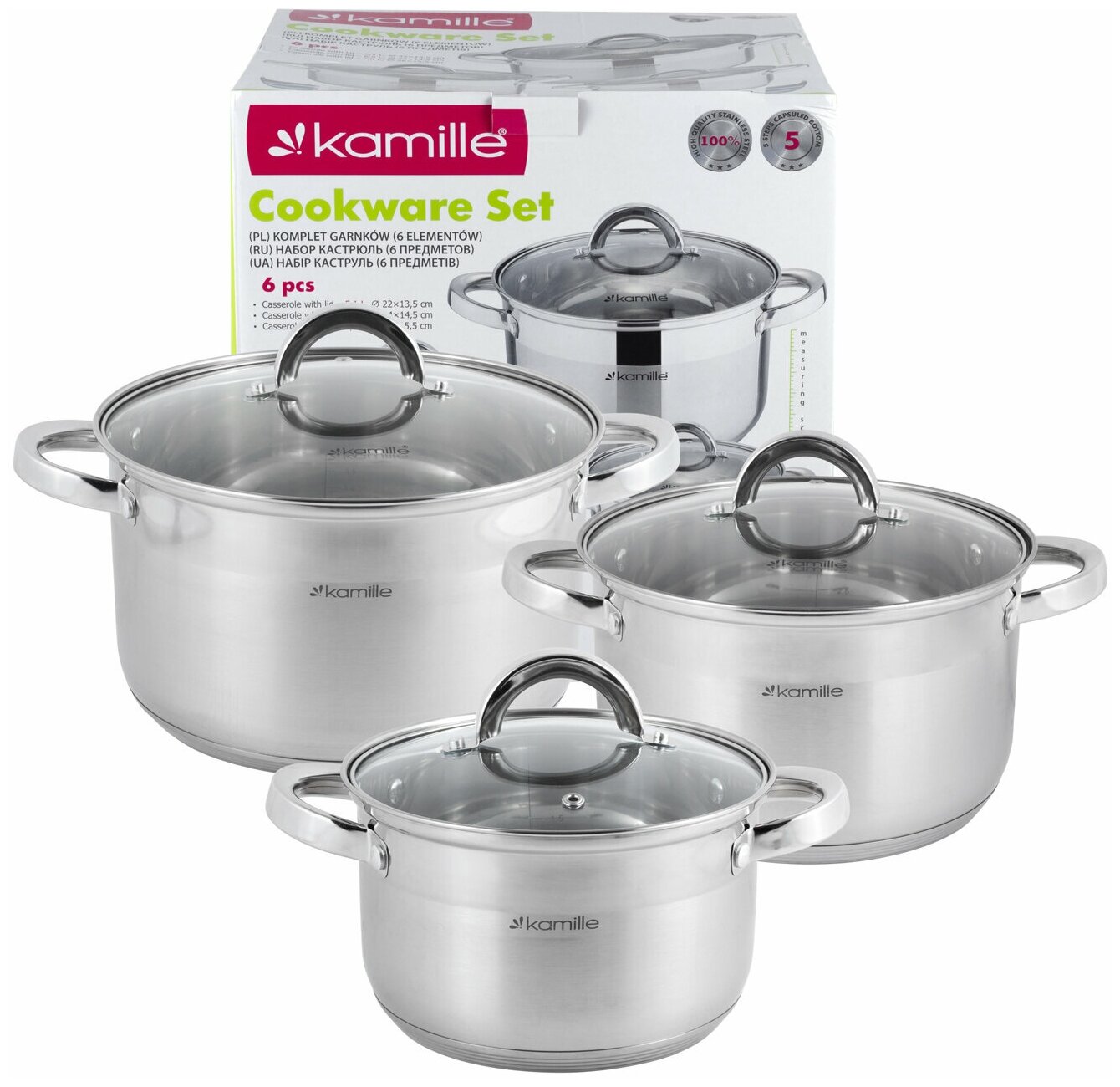 Цена для г. Курчатов. Набор кастрюль Kamille — это всегда вкусное и здоровое приготовление пищи. Кастрюли выполнены из качественной нержавеющей стали с применением современных технологий производства. Такие кастрюли имеют прекрасный внешний вид, оснащены 5-слойным капсульным дном и отличаются высокой прочностью и долговечностью в использовании. Магазины в городе Курчатов смотрите ниже