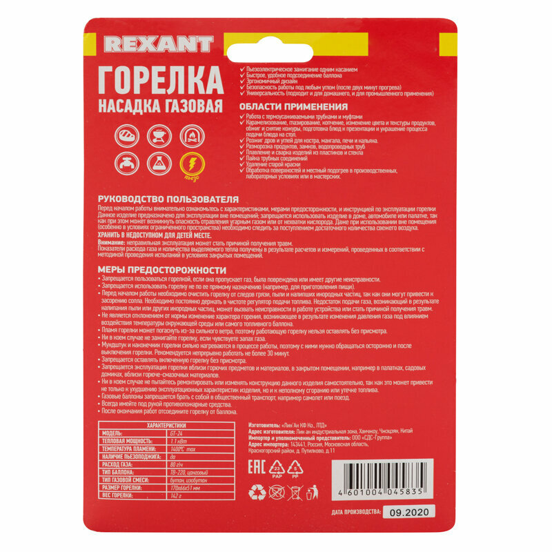 Цена для г. Курчатов. Газовая горелка-насадка REXANT GT-24 с пьезоподжигом обладает небольшим расходом топлива 80 г/час. Рекомендуется для работы с термоусаживаемыми трубками, перчатками, муфтами; для плавления и сварки изделий из пластиков и стекла; для снятия старой краски; для разморозки замков, водопроводных труб, продуктов; для копчения продуктов или карамелизации десертов; для работ в саду и огороде; для розжига дров и углей. Магазины в городе Курчатов смотрите ниже