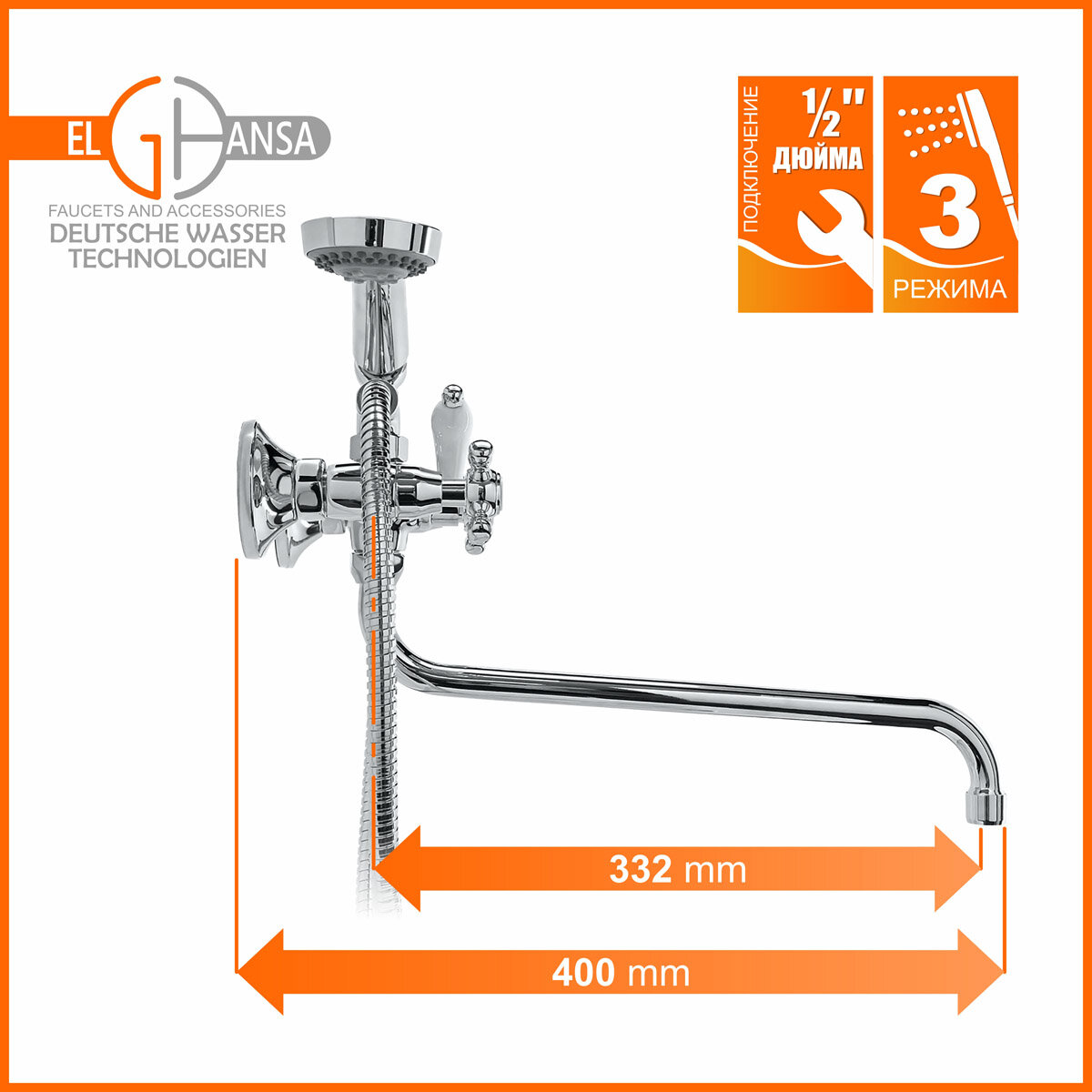 Цена для г. Курчатов. Смеситель (кран) из латуни с длинным поворотным изливом (носиком, гусаком) 37см для ванны (душа, душевой кабины) Elghansa Kimberli 2730063 двухвентильный с душевым гарнитуром: лейкой, шлангом 150см, хром глянец. Смеситель изготавливается из латуни- противостоит образованию коррозии, деформации под воздействием жесткой воды. Толщина и прочность материала гарантируют долгую службу и тихую работу смесителя (класс шумности I). Магазины в городе Курчатов смотрите ниже