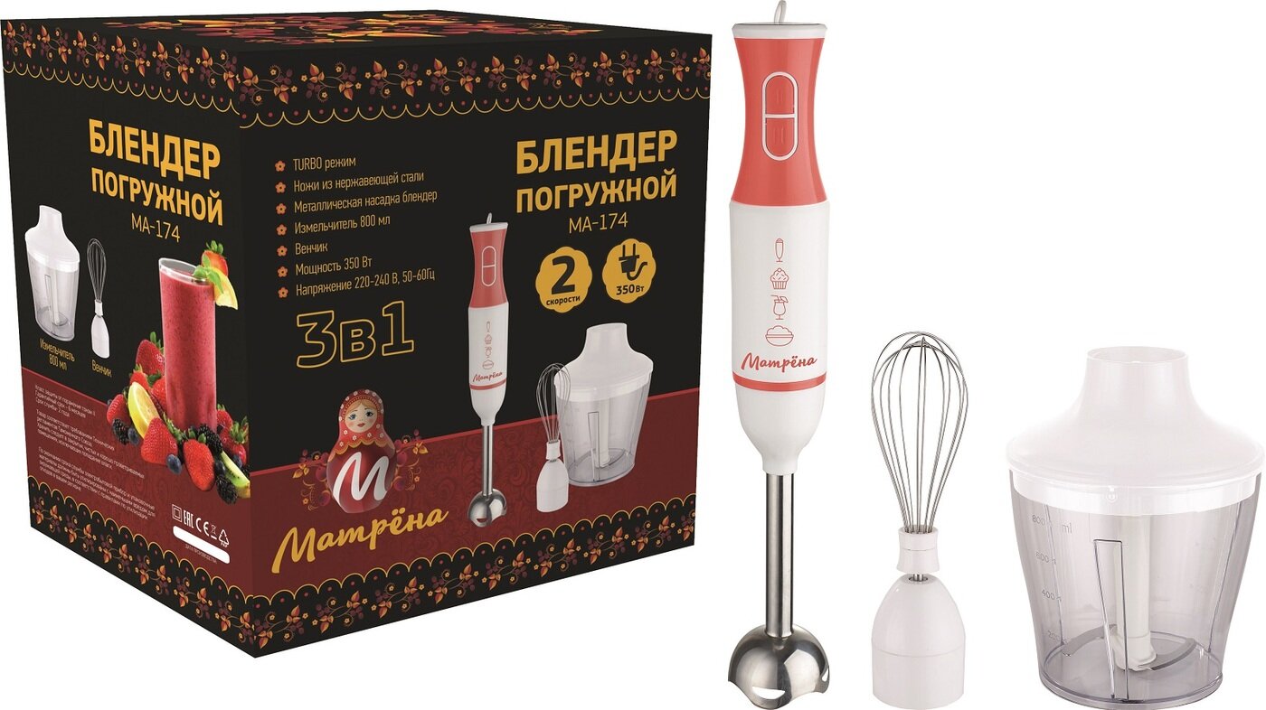 Блендер погружной МА-174(008219) матрёна 350Вт 0,5л электр. + венч. +измел. пластик