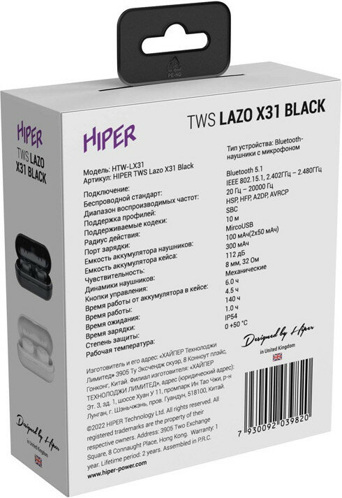 Hiper Наушники HIPER TWS Lazo X31 Black (HTW-LX31) Bluetooth 5.1, черный наушники в Курчатов