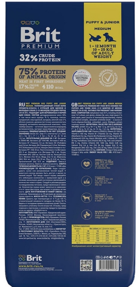 BRIT PREMIUM DOG PUPPY & JUNIOR MEDIUM для щенков и молодых собак средних пород с курицей (8 + 8 кг)