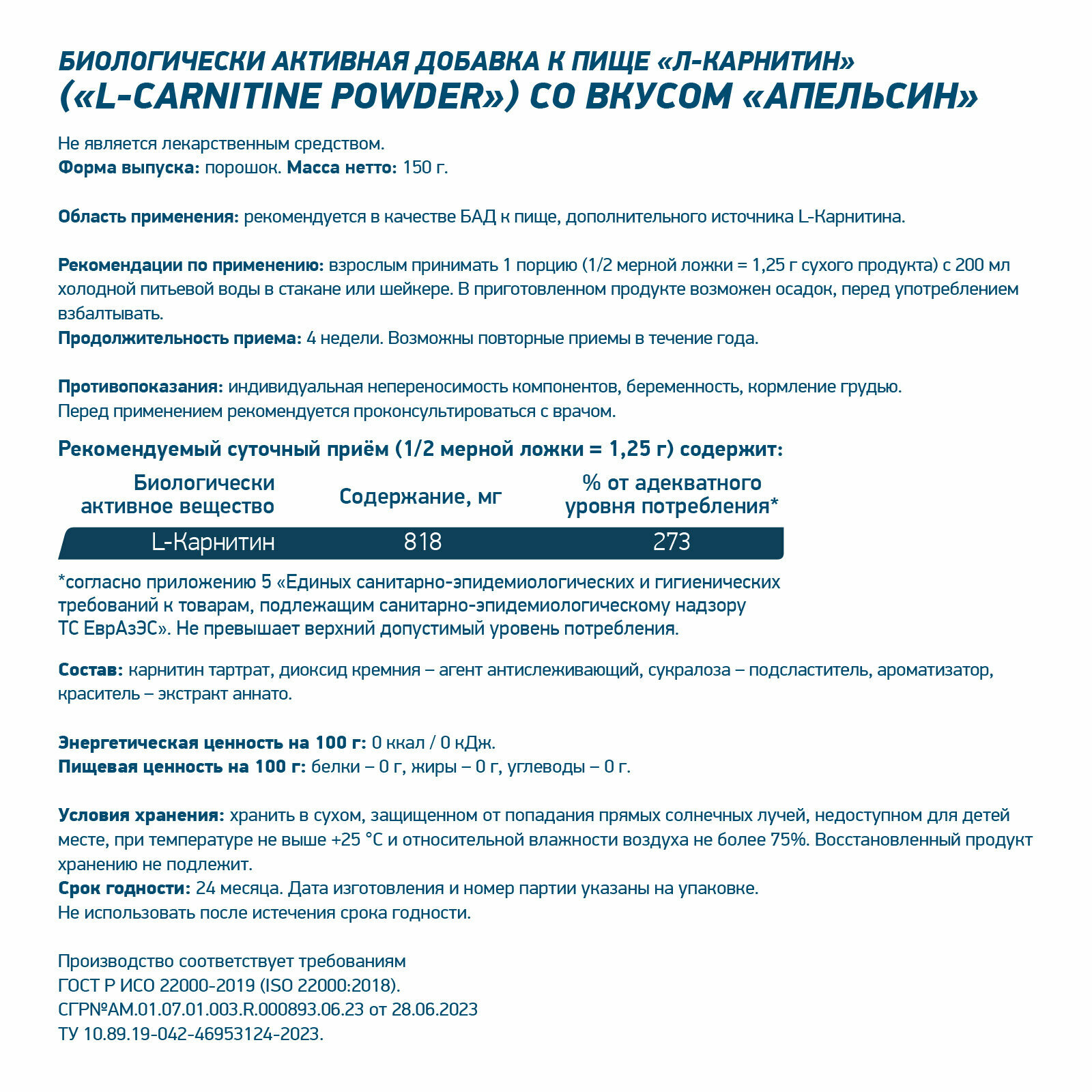 Л-карнитин CARNITINE Апельсин 150 грамм жиросжигатель для похудения и для снижения веса