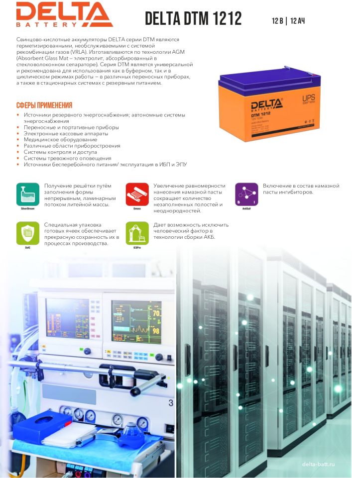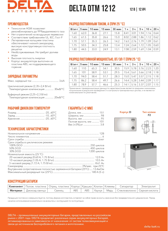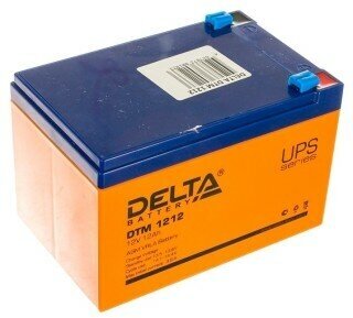 Батарея DELTA серия DTM, DTM 1212, напряжение 12В, емкость 12Ач (разряд 20 часов), макс. ток разряда (5 сек.) 180А, макс. ток заряда 3.6А, свинцово-кислотная типа AGM, клеммы F2, ДxШxВ 151х98х95мм., вес 3.8кг., срок службы 6 лет. Delta UPS DTM 1212 (12V