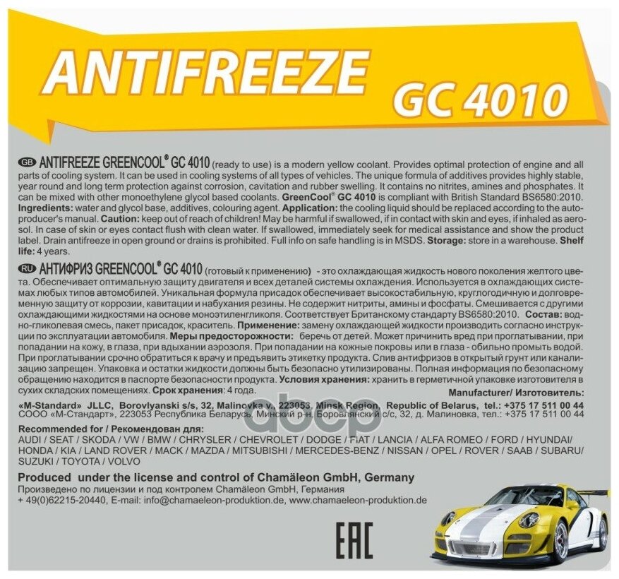 Цена для г. Курчатов. Антифриз GreenCool® GC 4010 – это готовая к применению охлаждающая жидкость нового поколения желтого цвета. Соответствует Британскому стандарту BS6580:2010. Производится по лицензии и под контролем Chamäleon GmbH (Германия). Для использования в системах охлаждения легковых автомобилей, а так же в качестве теплоносителя в теплообменных агрегатах в диапазоне температур от -40 до +110 °С. Магазины в городе Курчатов смотрите ниже