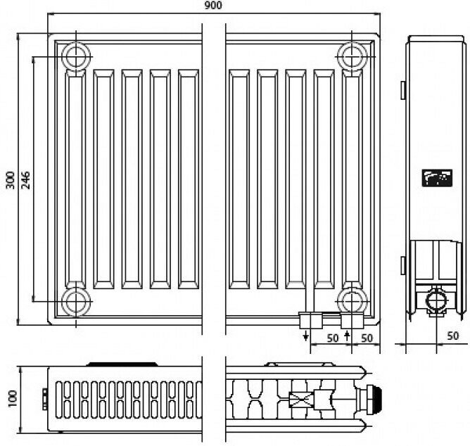 Радиатор панельный KERMI Profil-V_FTV тип 22 высота 300 ширина 900 профильный, нижнее подключение 3/4"