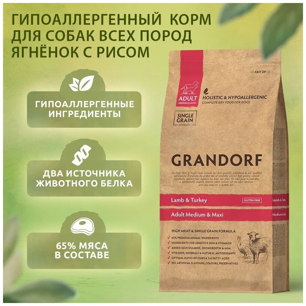 GRANDORF Lamb & Turkey Adult Medium&Maxi ягненок с индейкой для взрослых собак средних и крупных пород от 1 года 3 кг