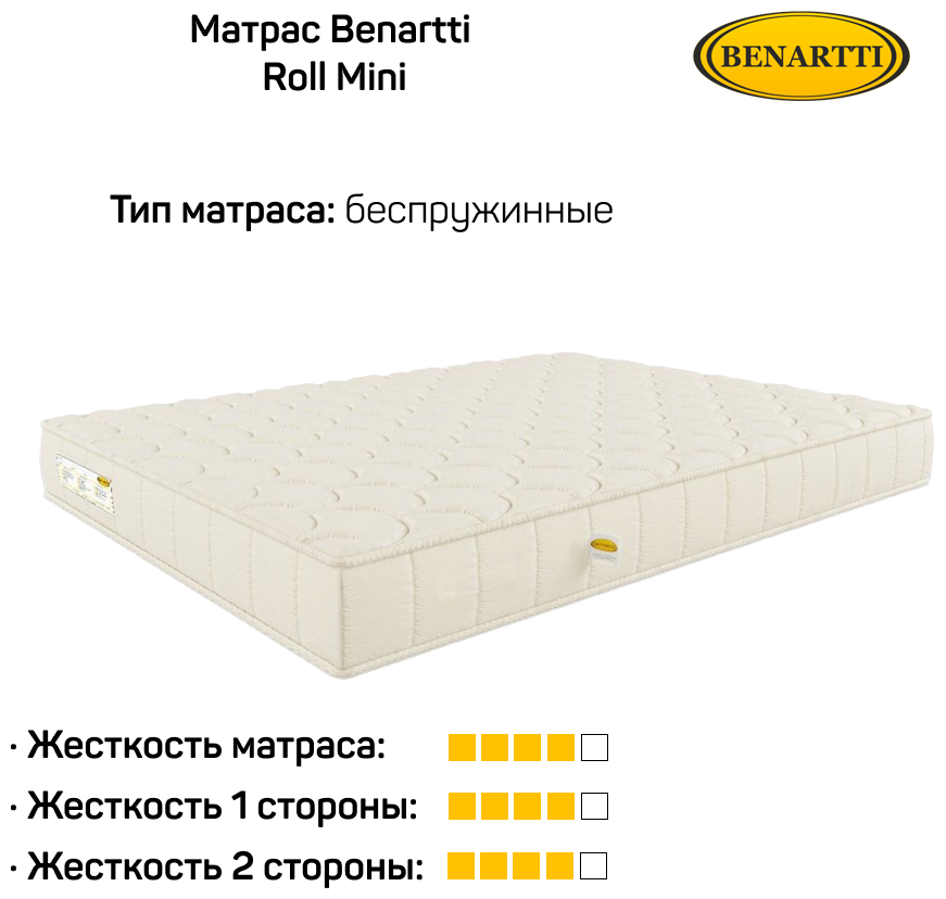 Цена для г. Курчатов. Матрас Benartti Roll Mini. Матрас Roll Mini с одинаковыми сторонами жесткости, общая высота 14 см. Когда говорят "спать, как на облаке" - это про этот матрас. Максимально допустимая нагрузка на одно спальное место до 110 кг. Матрас является беспружинным, основой служит экологически чистый материал выше средней жесткости искусственный латекс высотой 14 см. Чехол матраса, выполнен из хлопкового жаккарда, простеганного на экологически чистом материале Hollcon. Магазины в городе Курчатов смотрите ниже