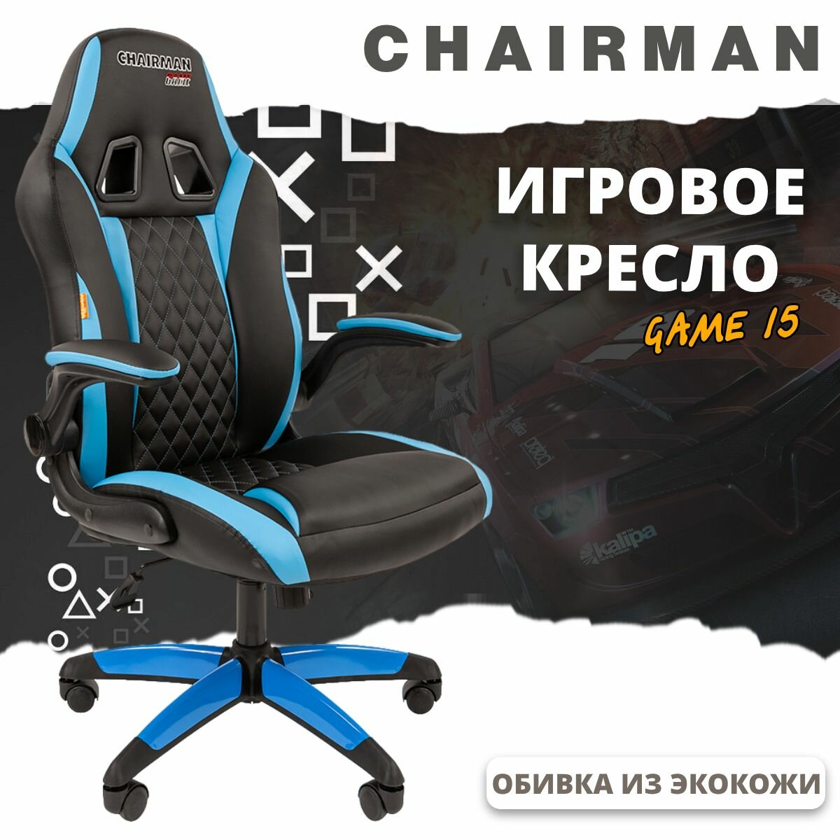 Игровое компьютерное кресло с откидными подлокотниками CHAIRMAN GAME 15, экокожа, черный/голубой