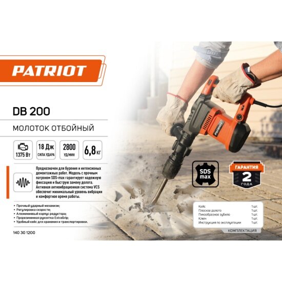 Отбойный молоток Patriot DB 200, мощность 1375 Вт, энергия удара 18 Дж, 2800 уд./мин., 2 зубила, в комплекте кейс