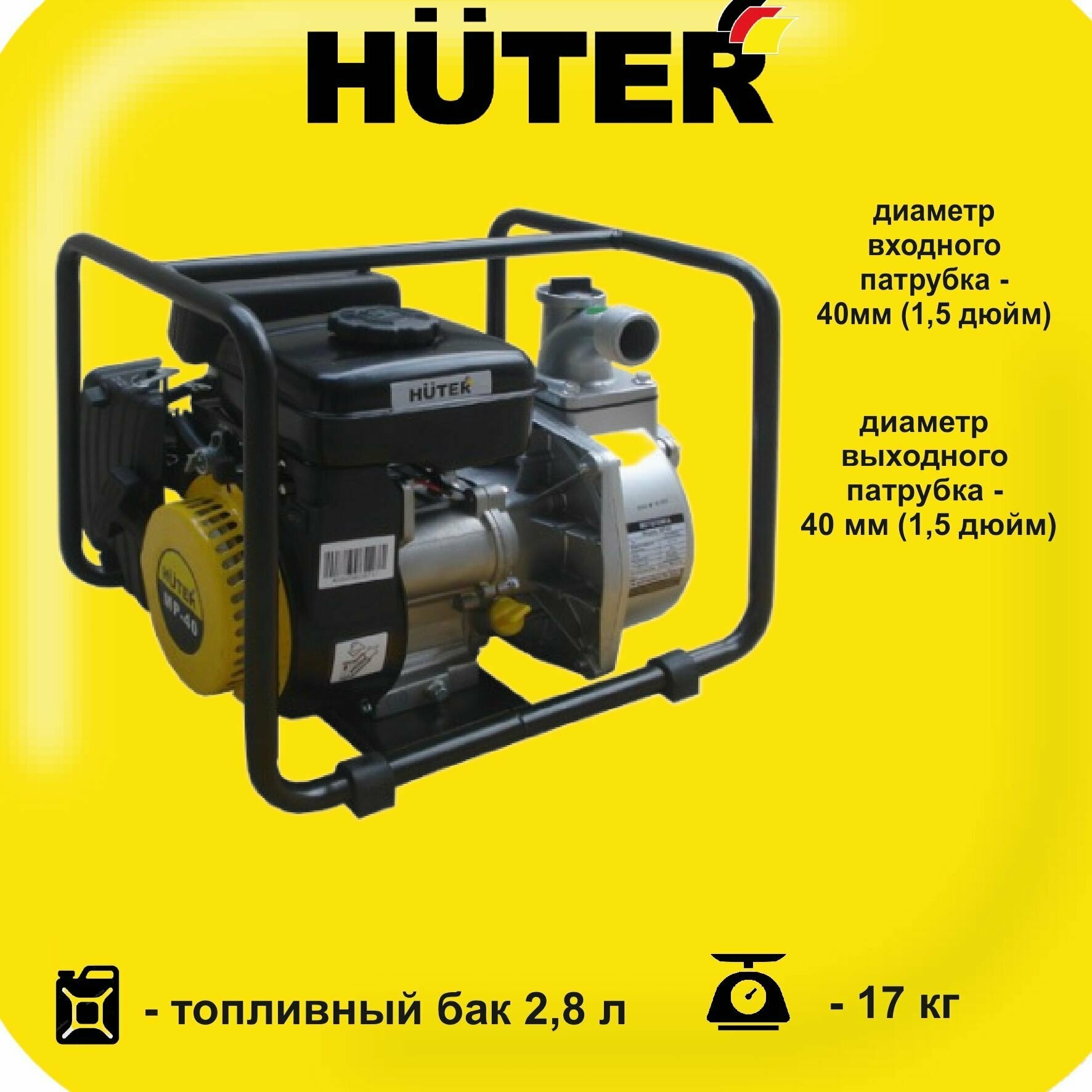 Мотопомпа HUTER MP-40, центробежная, самовсасывающая, для чистой воды, 2.8 л. с, 3800 об/мин, 40/1.5 мм/дюйм, 300 л/мин