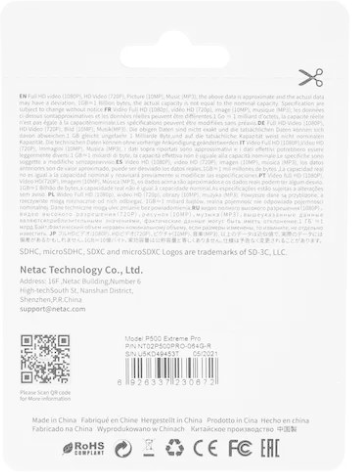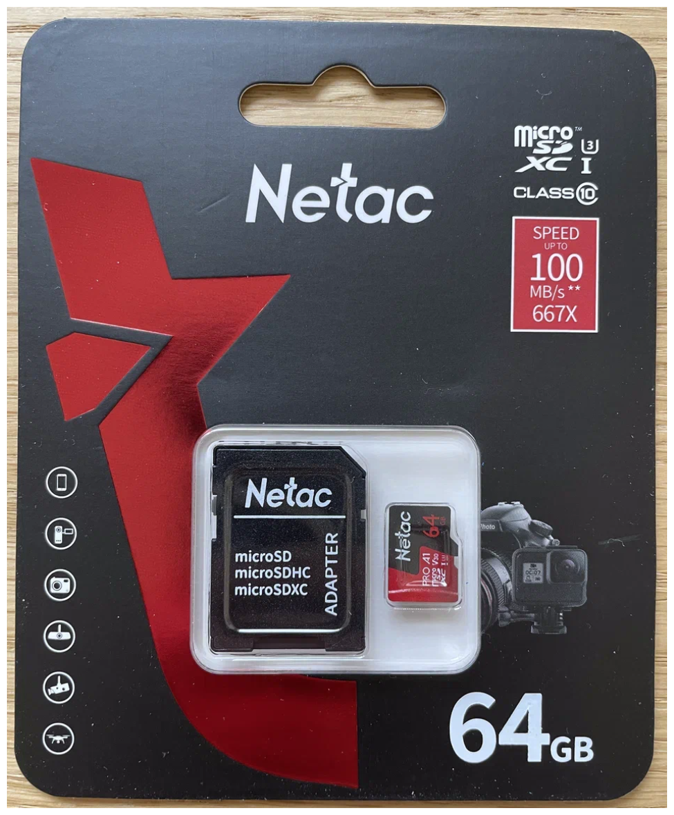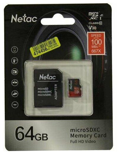 MicroSDHC 64Gb Netac P500 Extreme Pro A1 V10 Class 10 Uhs-i (u1), Nt02p500pro-064g-r, R100Mb/s, SD а .