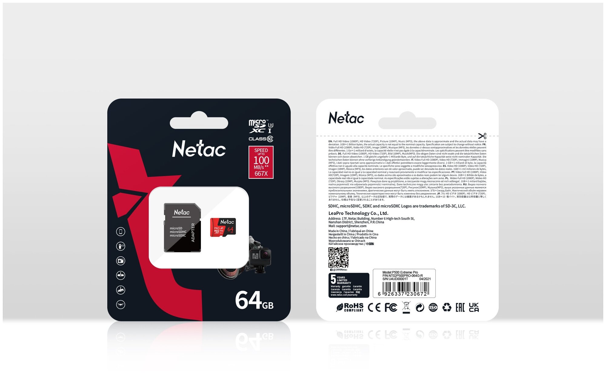 Флеш карта MicroSDHC 64Gb Netac P500 Extreme Pro up to 100MB/s pack with SD Adapter (NT02P500PRO-064G-R)