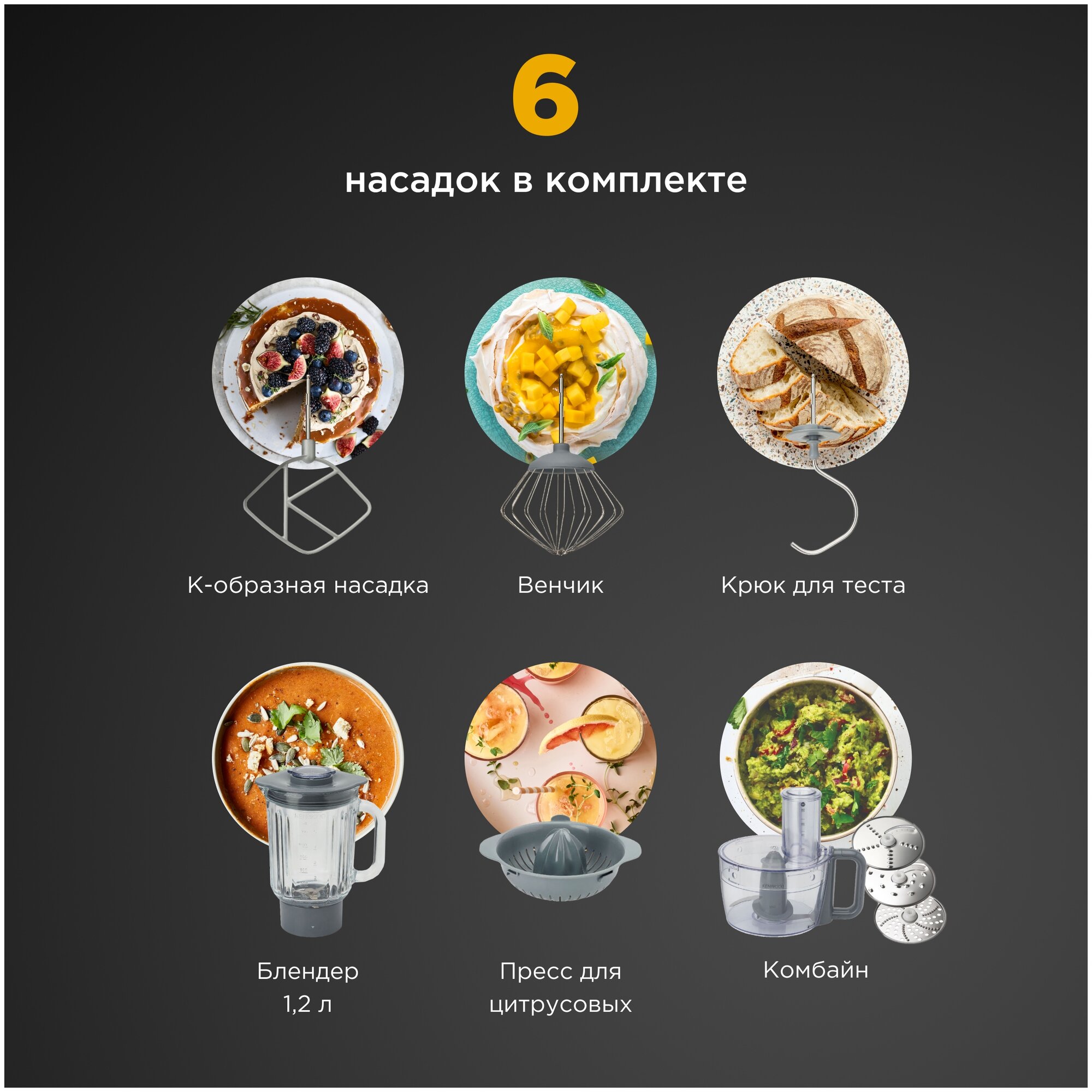 - венчик для взбивания / биттер для перемешивания / насадка / крюк для замеса теста / 2 диска для фарша / нож для измельчителя / 2 насадки для нарезки/шинковки / диск для драников (дерунов)