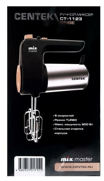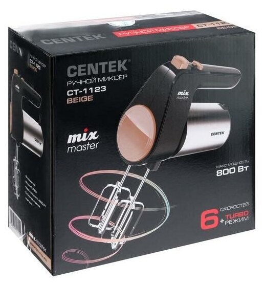 Centek Миксер Centek CT-1123 Beige, ручной, 800 Вт, 6 скоростей, турбо-режим, чёрно-бежевый