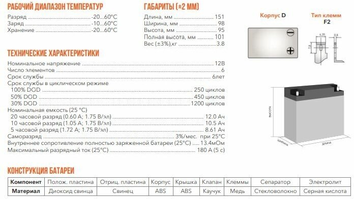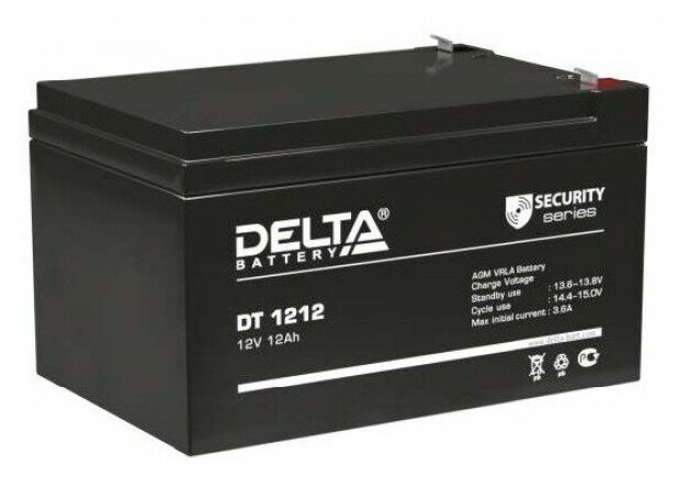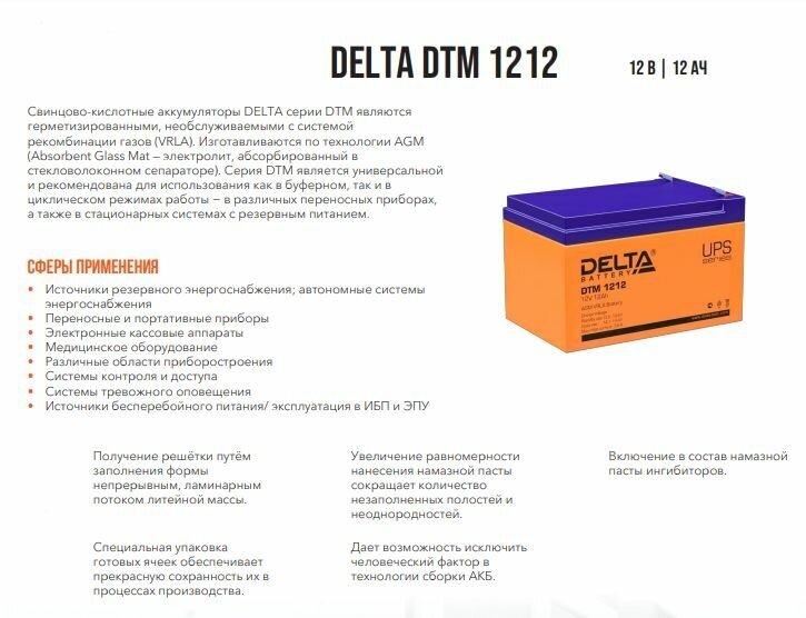 Батарея DELTA серия DTM, DTM 1212, напряжение 12В, емкость 12Ач (разряд 20 часов), макс. ток разряда (5 сек.) 180А, макс. ток заряда 3.6А, свинцово-кислотная типа AGM, клеммы F2, ДxШxВ 151х98х95мм., вес 3.8кг., срок службы 6 лет. Delta UPS DTM 1212 (12V