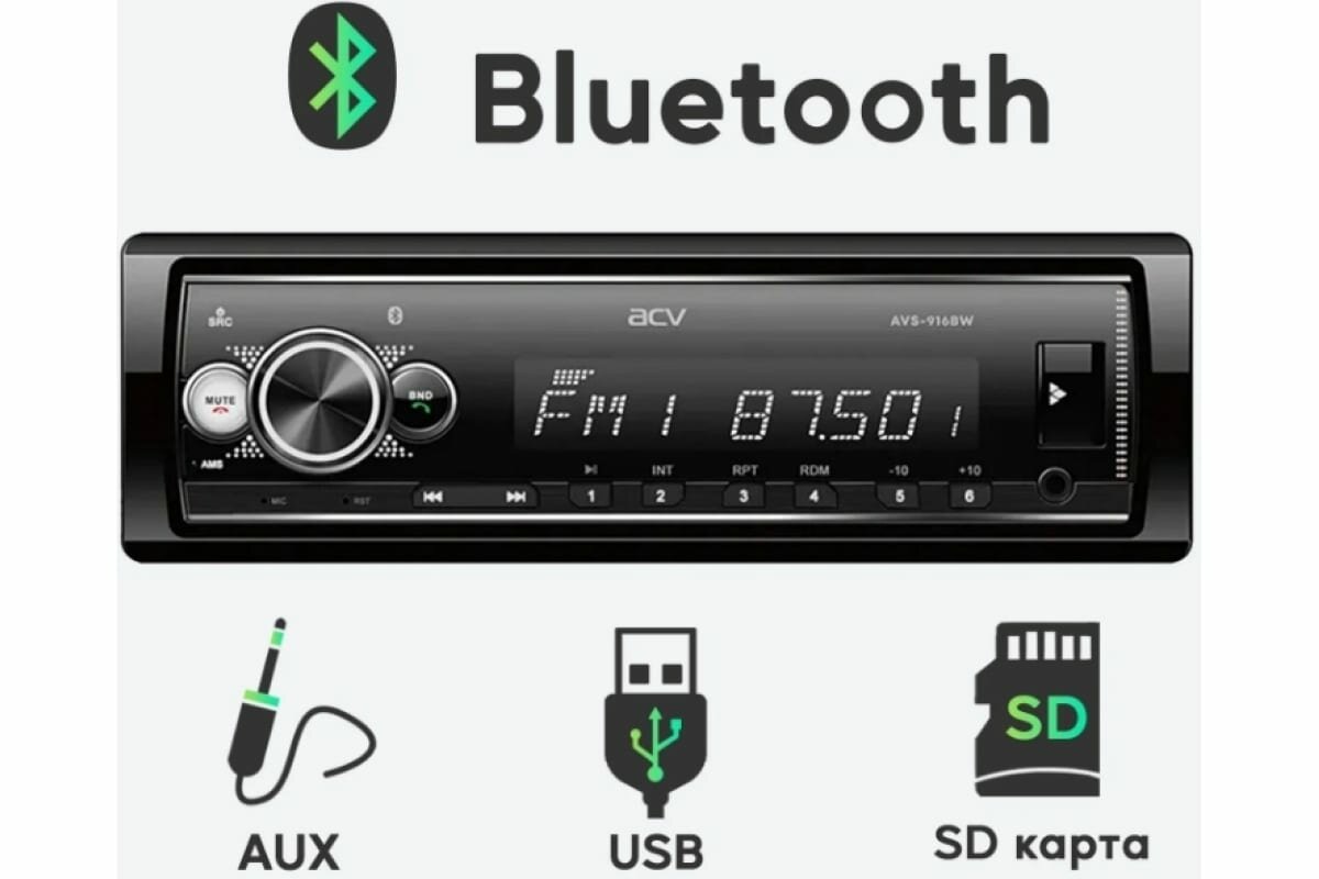 Автомобильный ресивер с Bluetooth, поддержкой ACV RC и ACV Control, зеленая подсветка ACV AVS-916BG