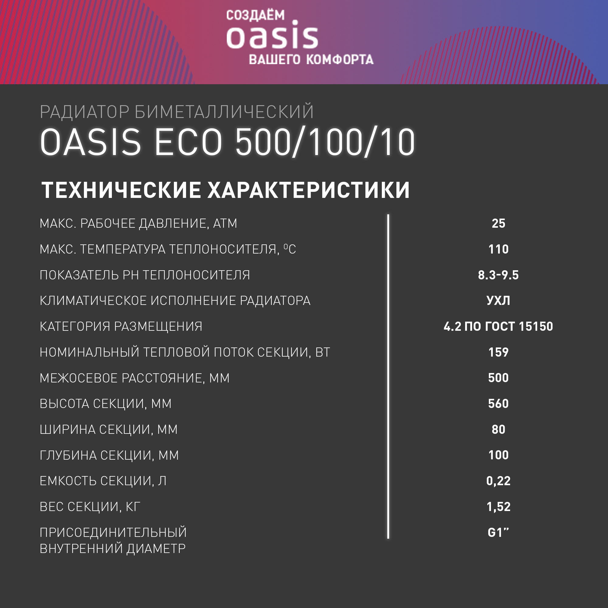 Биметаллический радиатор Oasis ECO 500/80 10 секций, 1520 Вт, Россия
