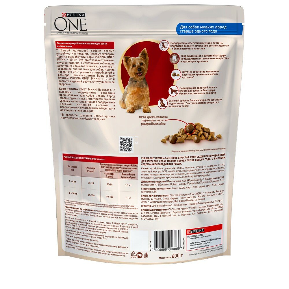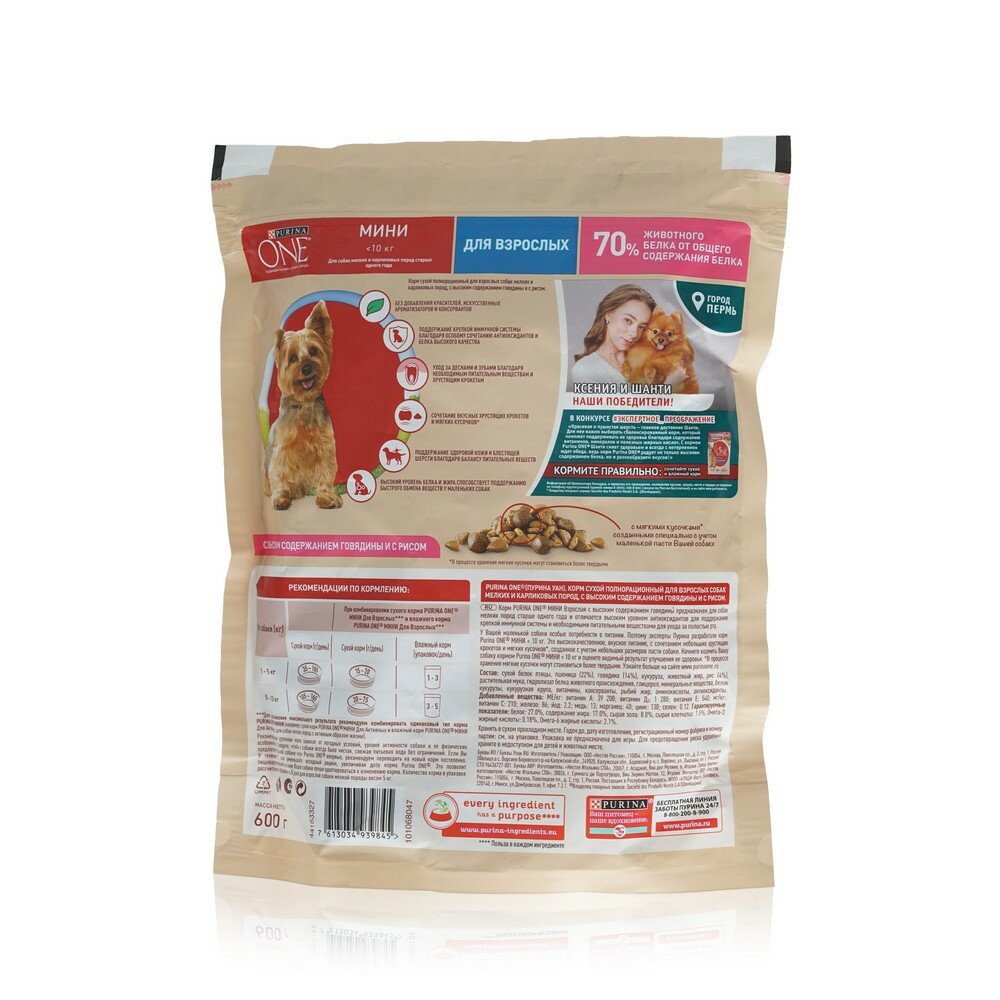 PURINA ONE мини 600г сухой корм для собак мелких пород с высоким содержанием говядины с рисом