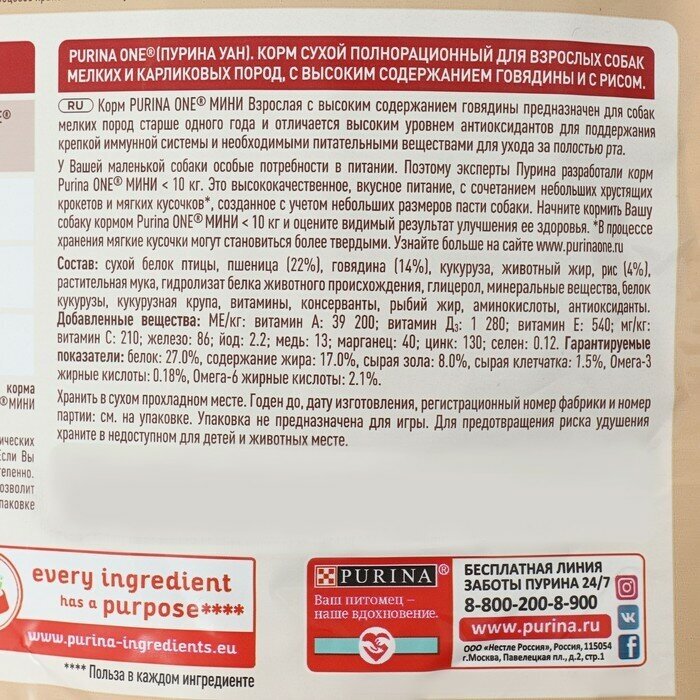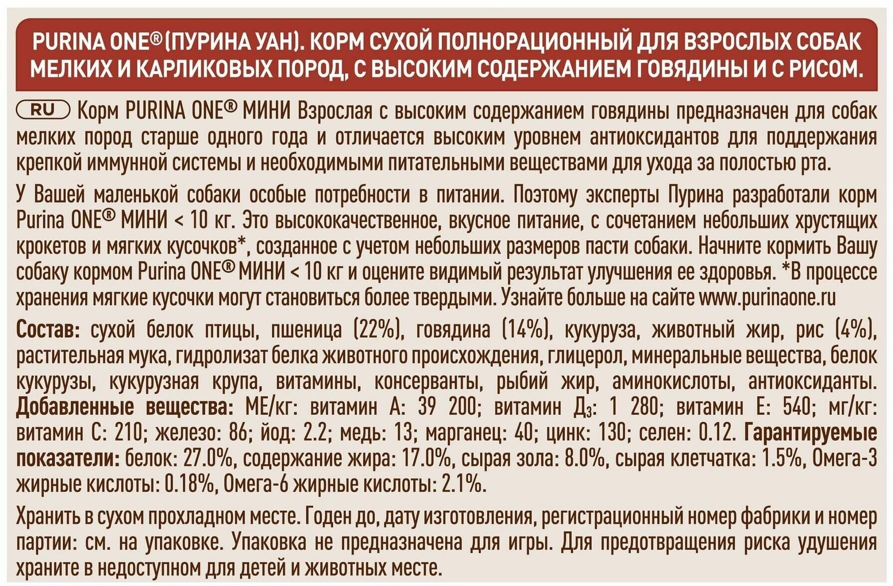 Сухой корм Purina ONE мини <10 кг для взрослых собак мелких и карликовых пород, с говядиной и с рисом, 1,5 кг