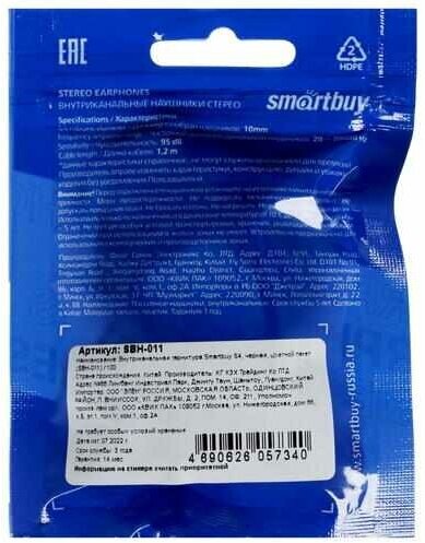 Наушники SmartBuy S4 SBH-011, вакуумные, микрофон, 93 дБ, 16 Ом, 3.5 мм, 1 м, черные(3 шт.)