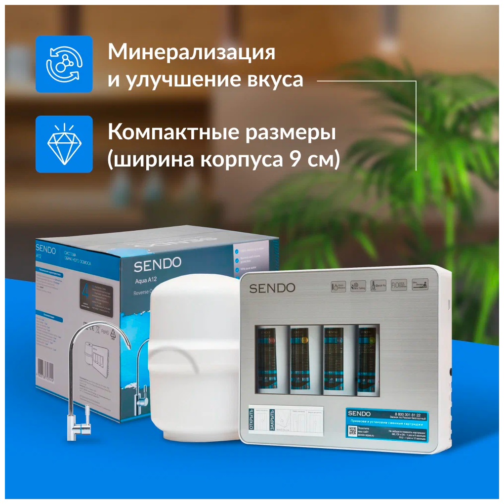 Цена для г. Курчатов. Sendo Aqua A12 – это система фильтрации водопроводной воды для всей семьи, работающая по принципу обратного осмоса с производительность 184 миллилитра в минуту. Технология позволяет осуществлять качественную очистку водопроводной воды посредством прохождения через 4-х ступенчатую систему фильтрации и уничтожать до 99% вредоносных бактерий и микроорганизмов. SENDO Aqua А12 отлично подойдет для водопроводных сетей с рабочим давлением не ниже 2-х атмосфер. Магазины в городе Курчатов смотрите ниже