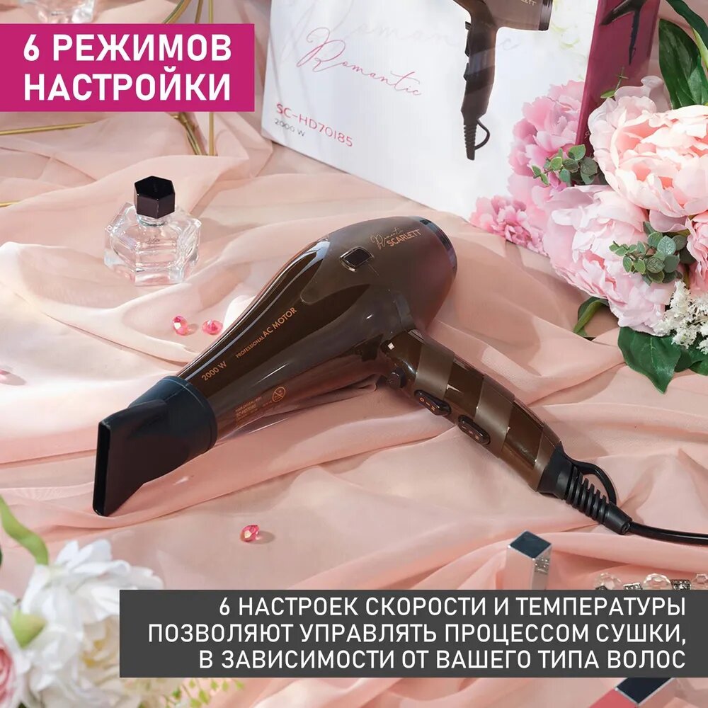 Фен профессиональный Scarlett SC-HD70I85, 2000 Вт, AC мотор, ионизация, 2 скорости, 3 температурных режима, 1 насадка, коллекция Romantic