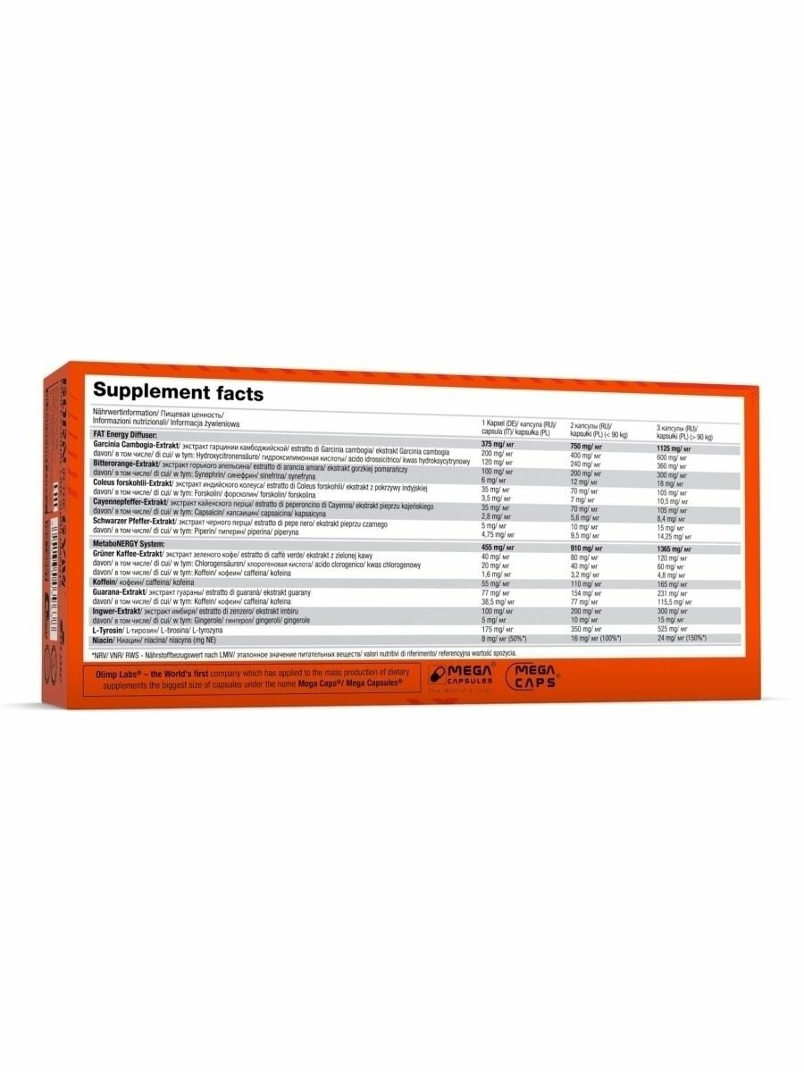 - кофеин / гуарана / синефрин (экстракт из горького апельсина) / экстракт зеленого чая / аминокислоты (тирозин) / биоперин