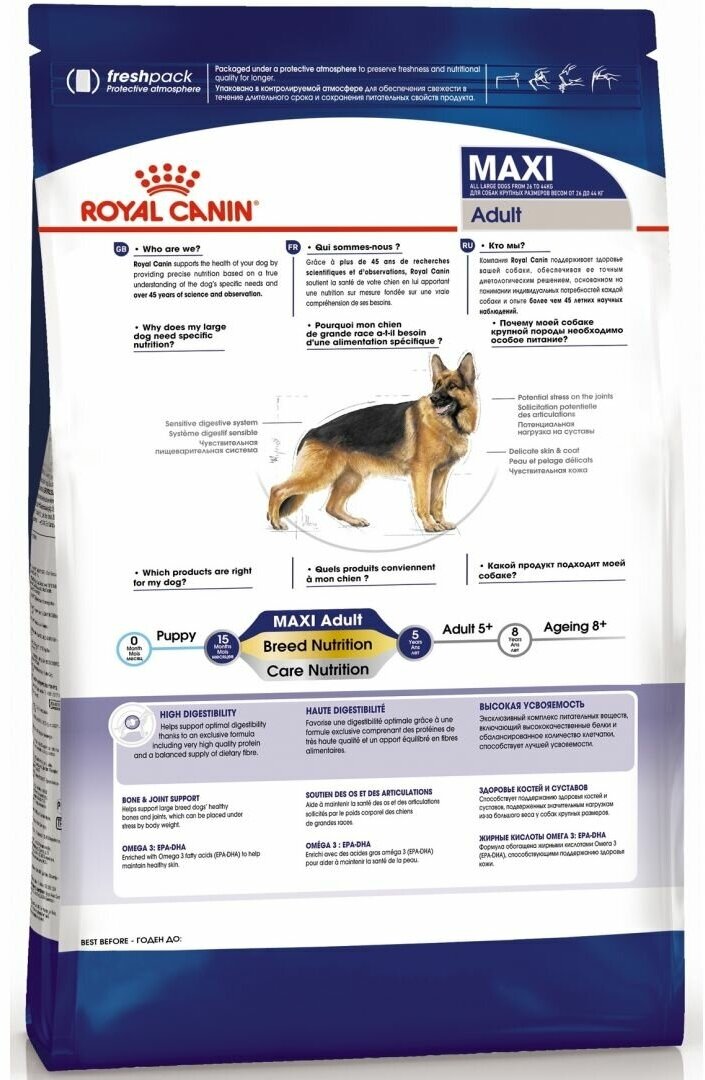 Корм сухой Royal Canin Maxi Adult для взрослых собак крупных пород (от 26 до 44 кг), от 15 месяцев до 5 лет, 15 кг