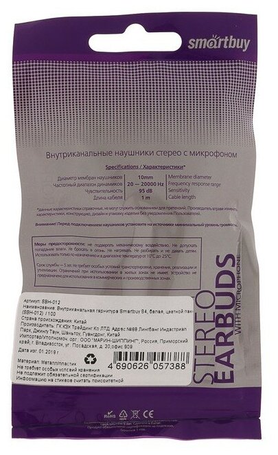 Внутриканальная гарнитура Smartbuy S4, белая, цветной пакет