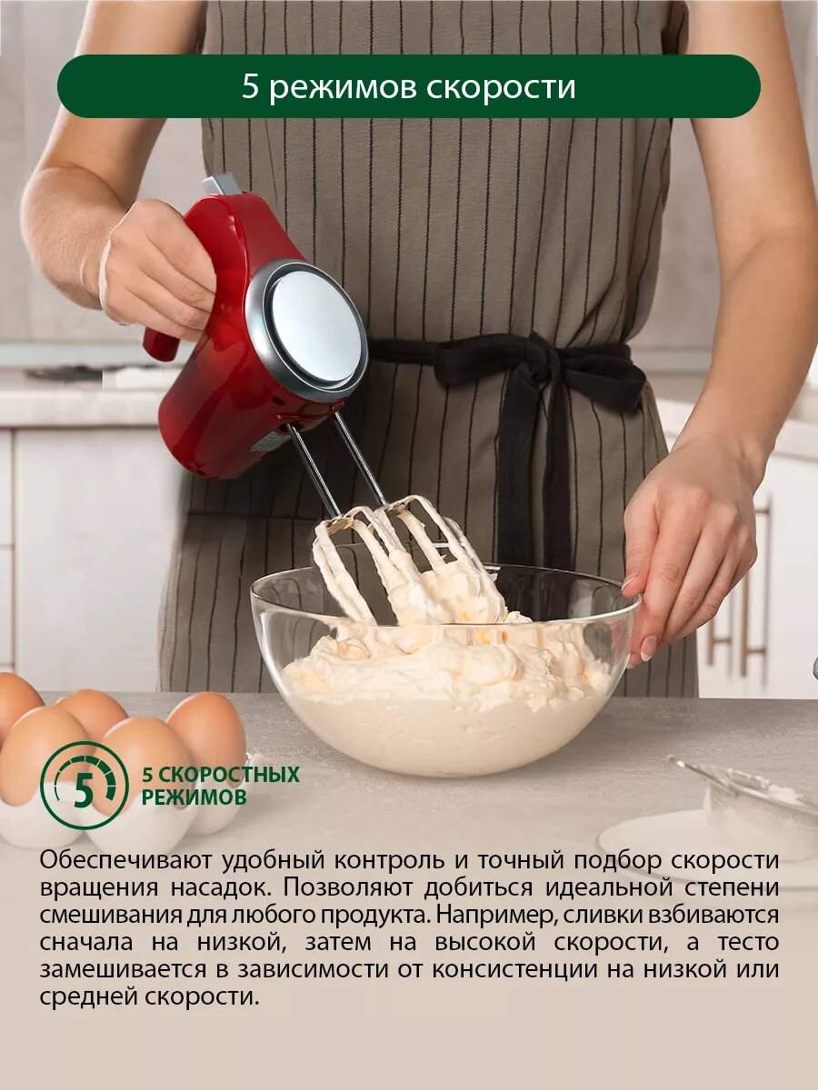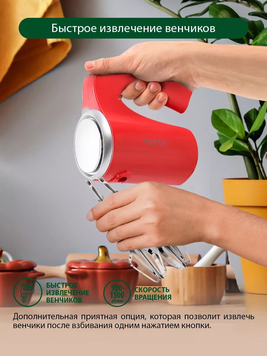 Миксер Marta MT-1512 красный рубин 350W 5 скоростных режимов, кнопка извлечения насадок, 2 комплекта .