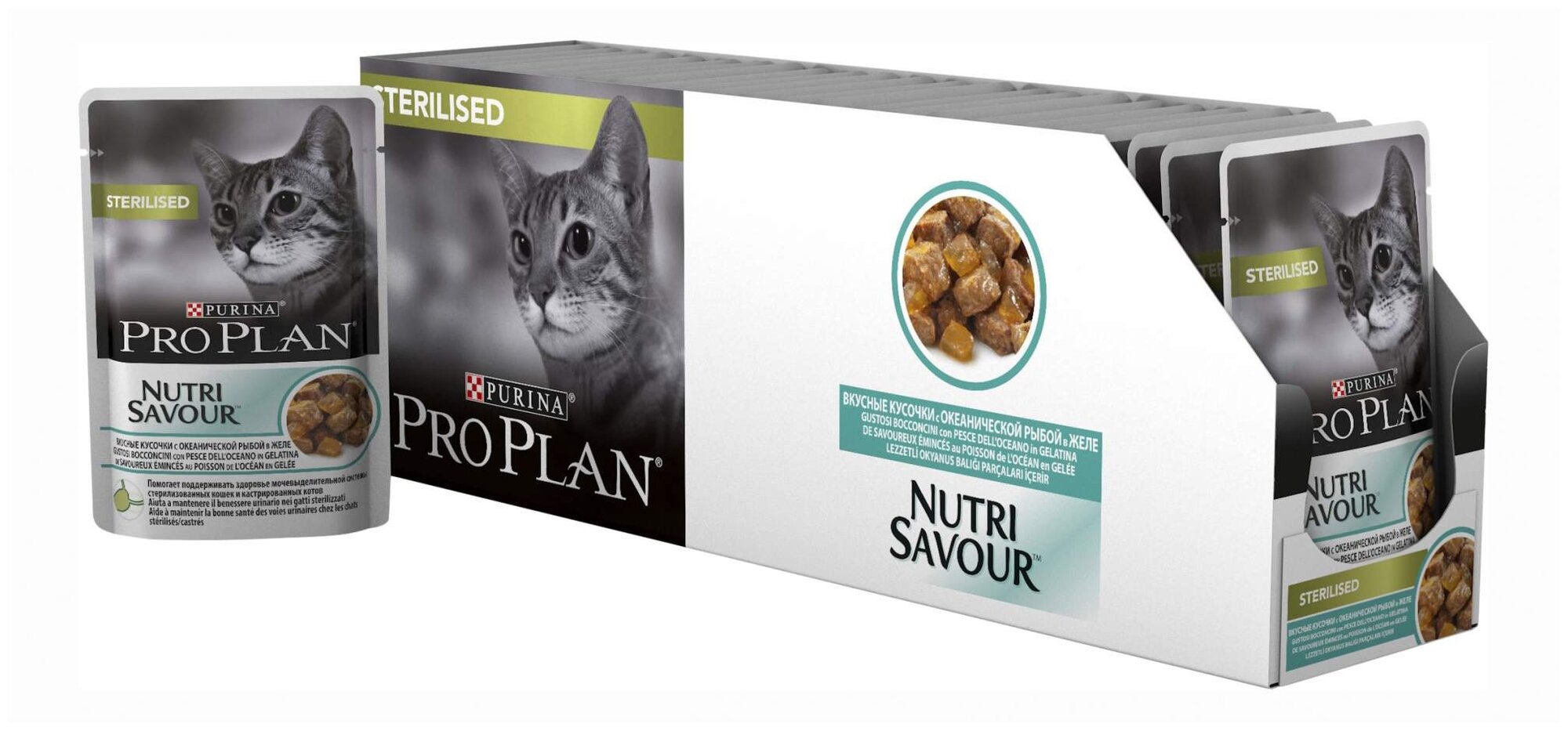 Влажный корм Pro Plan Nutri Savour для стерилизованных кошек и кастрированных котов, кусочки с океанической рыбой, в желе, Пауч, 85 гр. 26 шт.