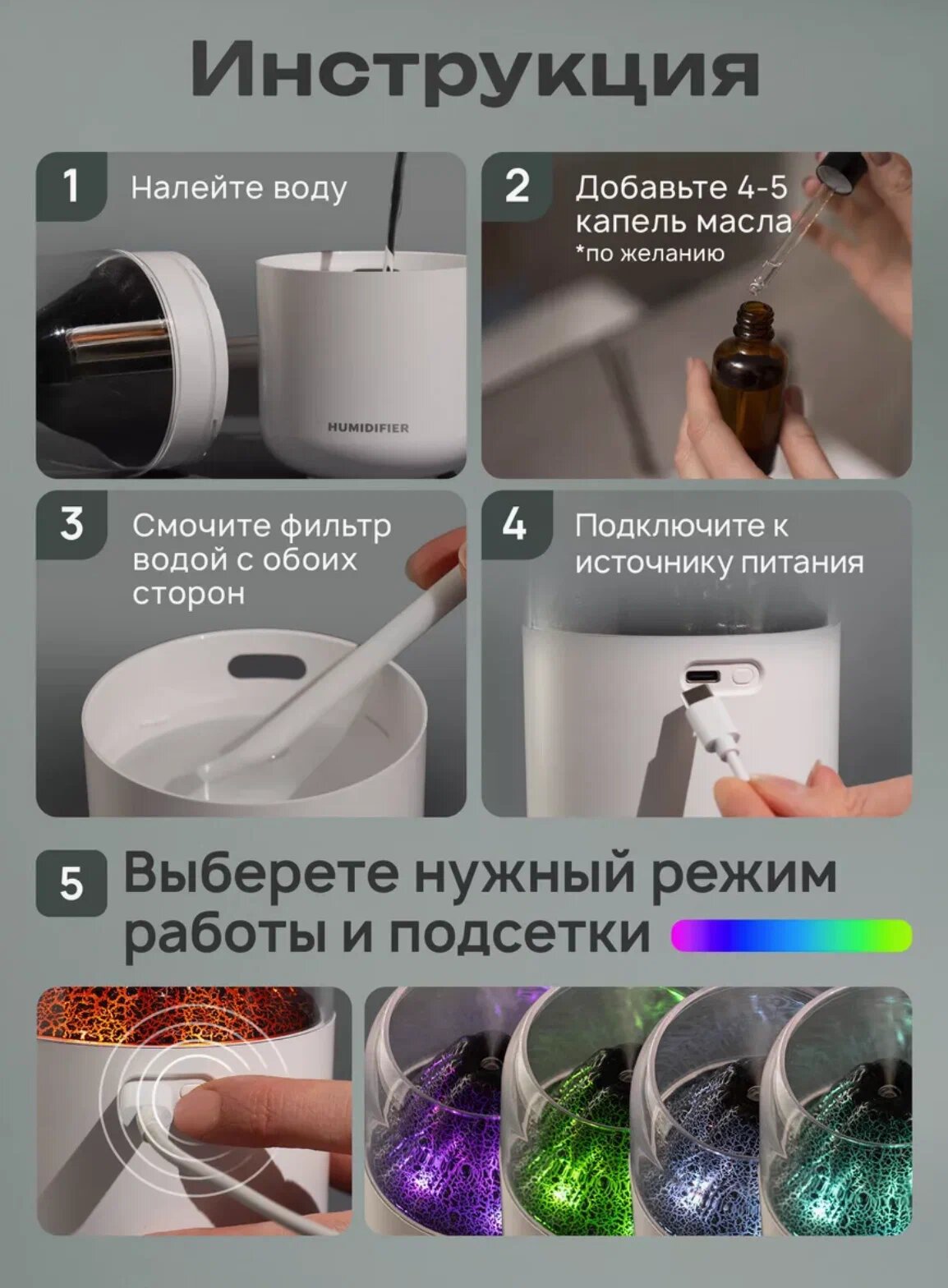 Увлажнитель воздуха для дома H2O/ портативный увлажнитель воздуха/ светодиодный увлажнитель воздуха/ VIRG Grey