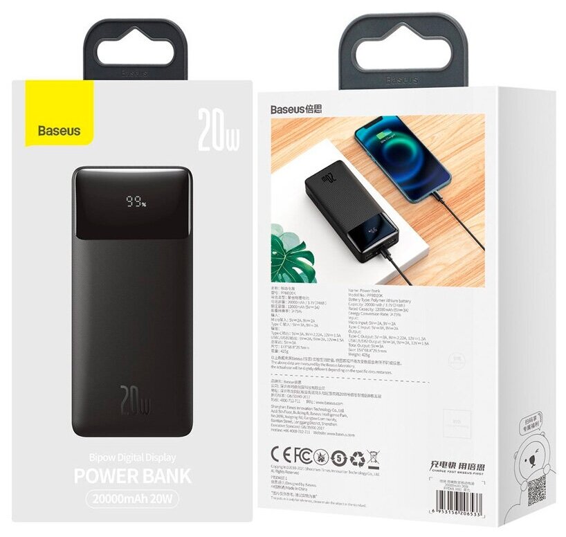 Baseus / Power bank Bipow Digital Display 20000mAh 20W 2USB + Type-C + Micro USB черный
