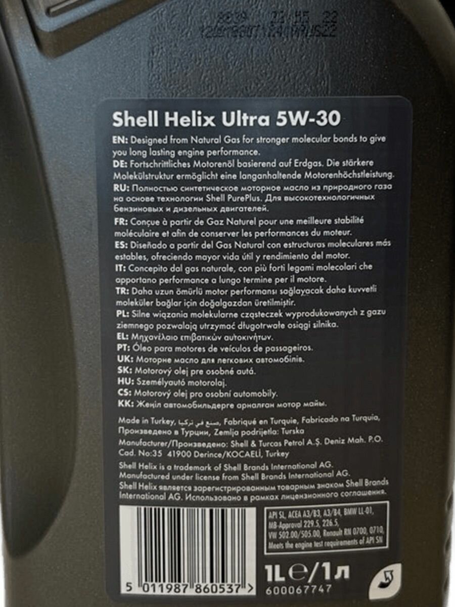 Синтетическое моторное масло SHELL Helix Ultra 5W-30 (550046387), импорт, без кода на крышке, Германия, 4 л
