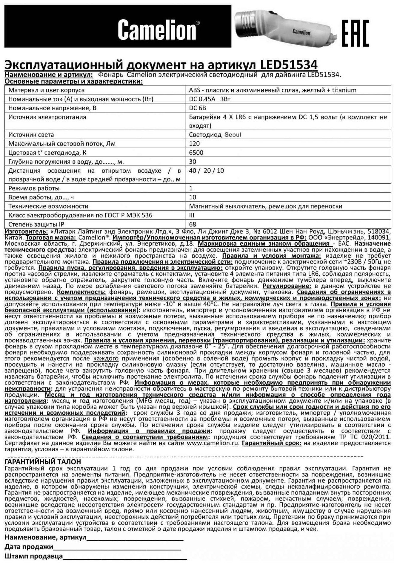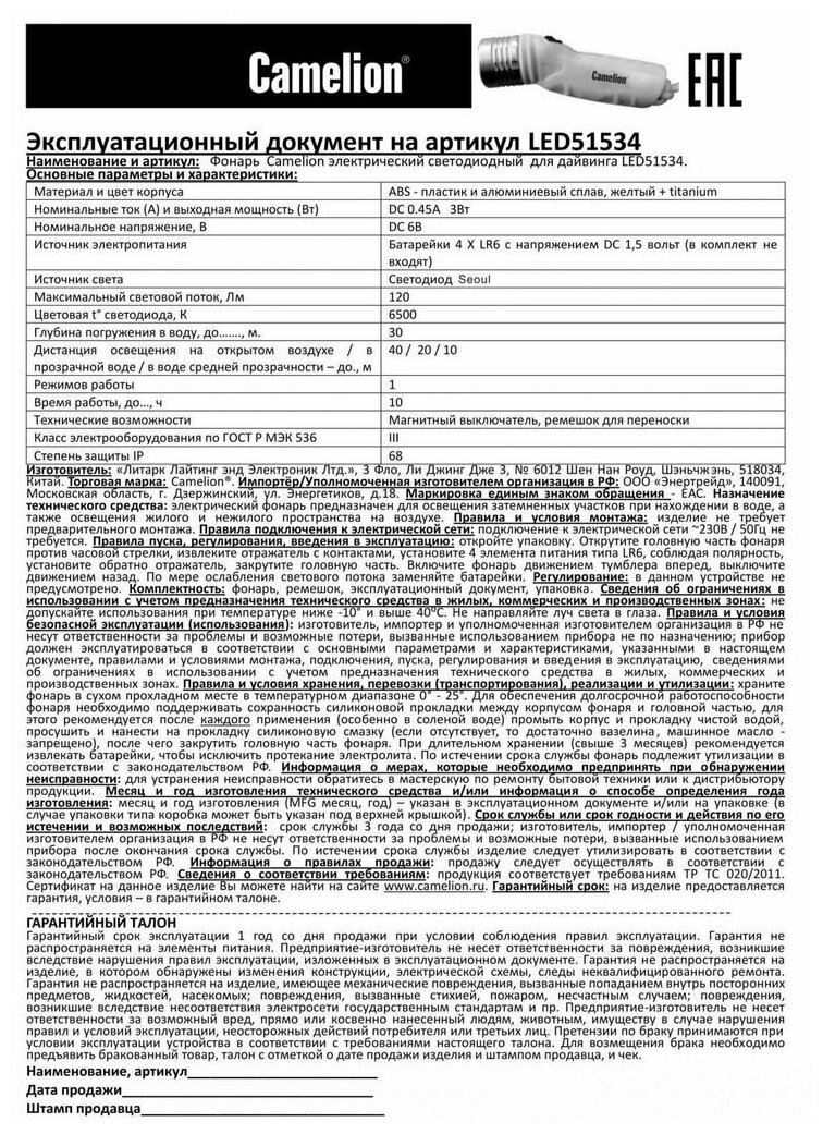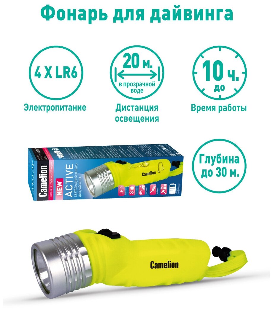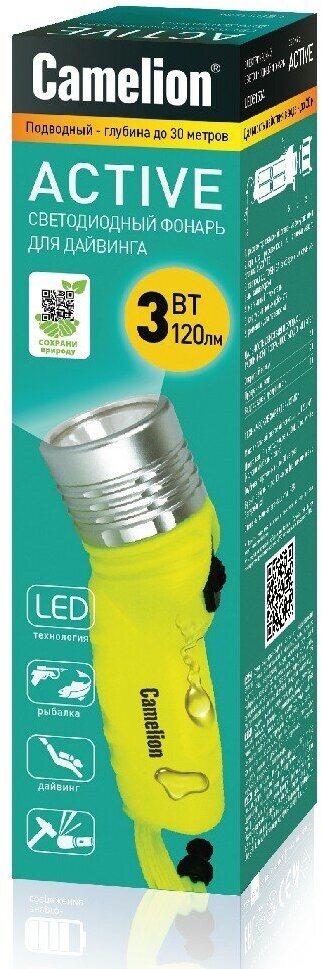 (фонарь, желт, LED 3W SEOUL глуб 30м, 4xLR6, дайв, пласт+алюм., блистер), CAMELION LED51534 (1 шт.)