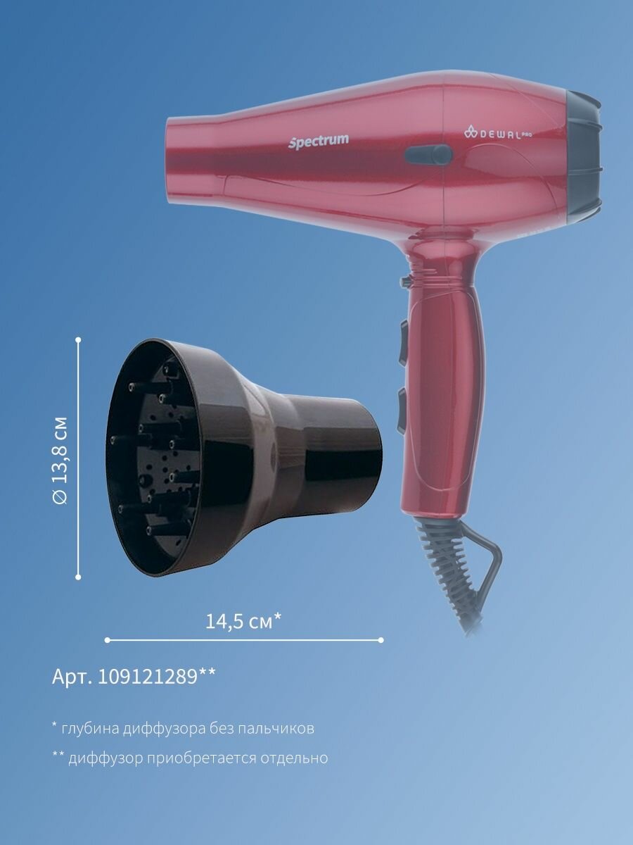 Фен DEWAL PRO SPECTRUM c ионизацией, красный, вес 600 гр, 2200 Вт, 2 насадки, провод 3 м 03-110 Red