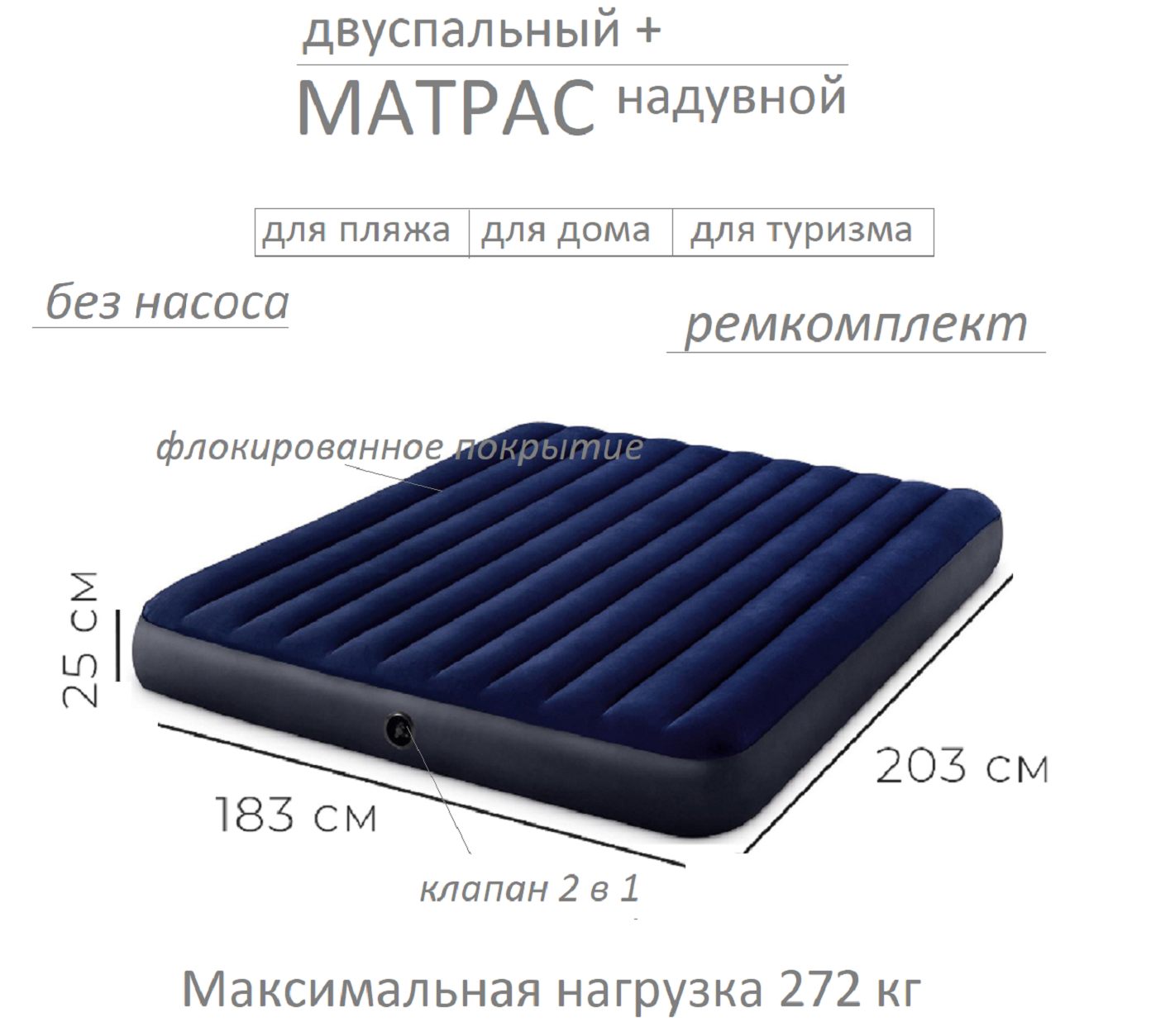 Матрас надувной Intex, 203х183х25 см, 64755, флокированный, 273 кг