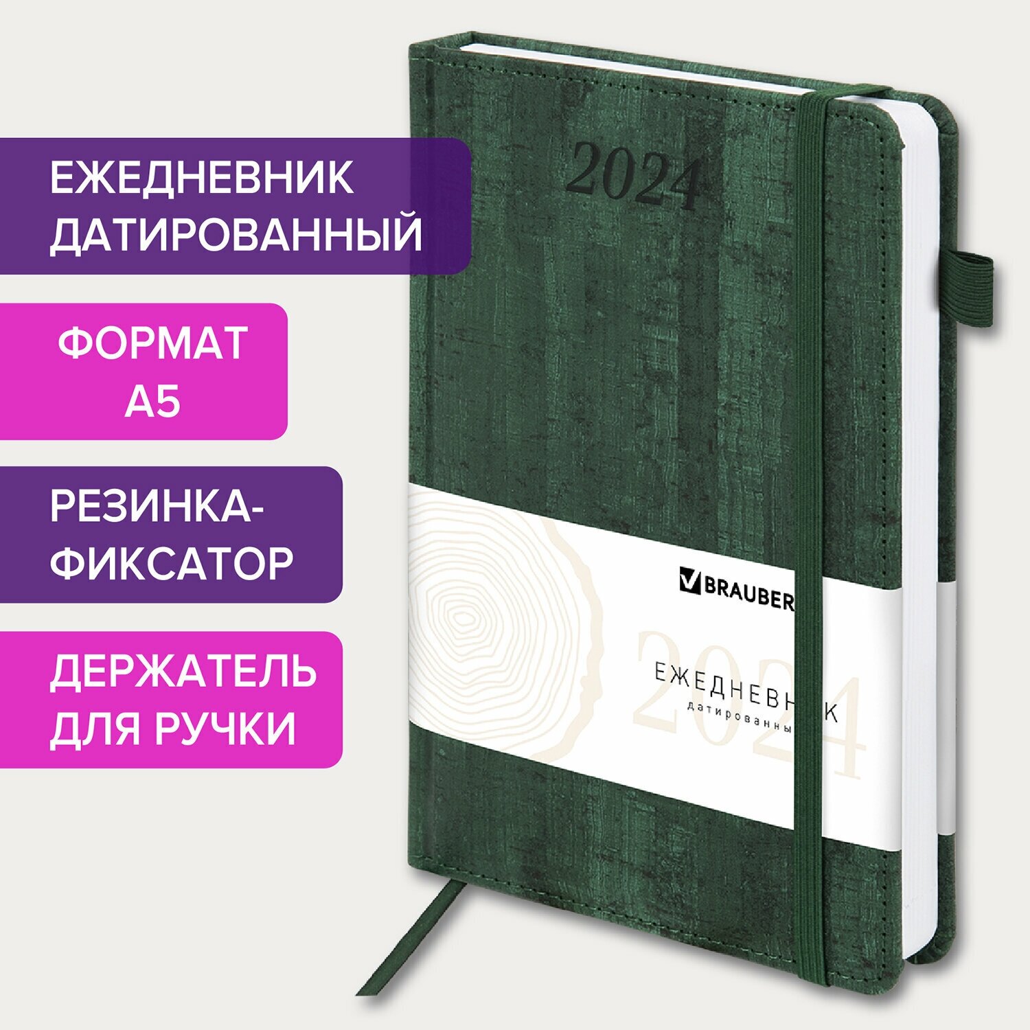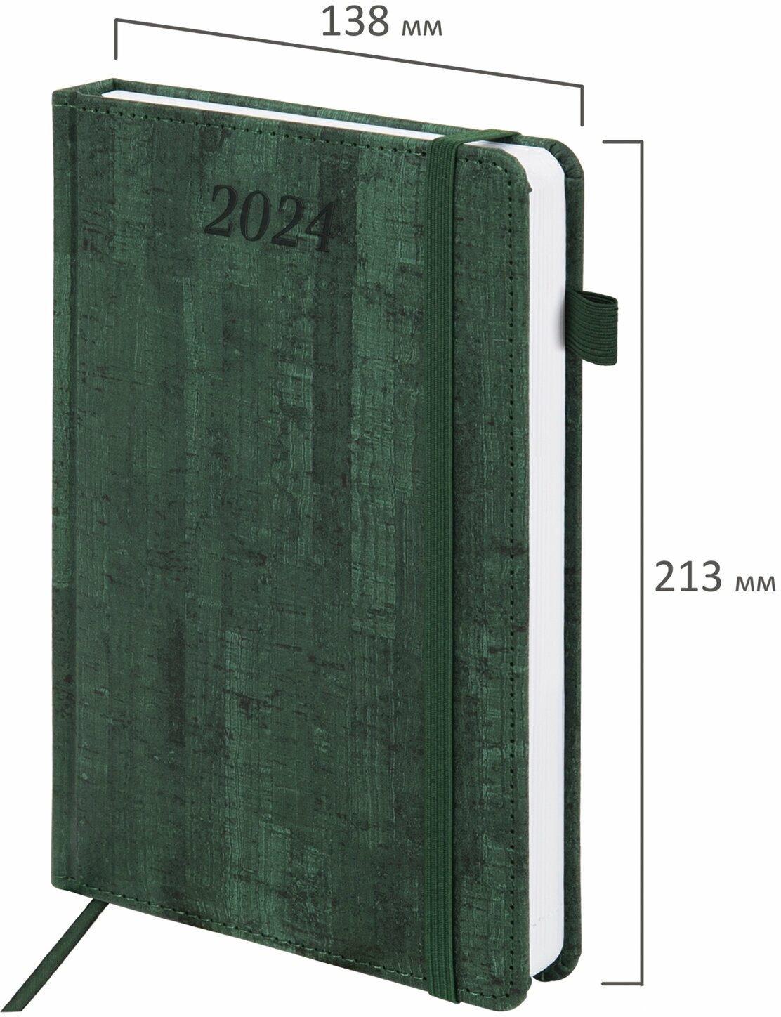 Ежедневник Brauberg датированный, 2024, А5, 138х213 мм, "Wood", под кожу, держатель для ручки, зеленый