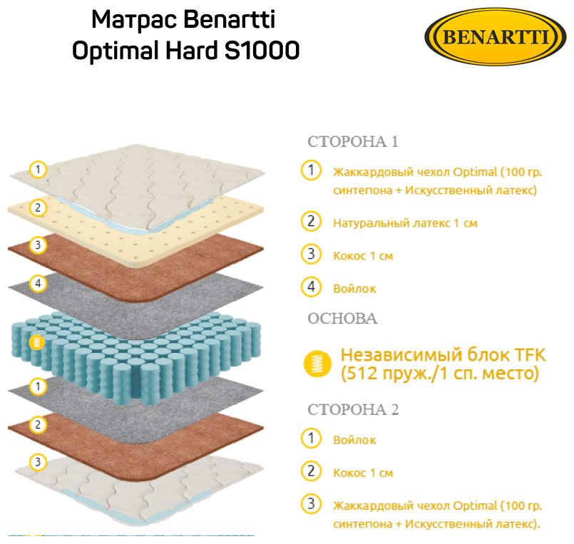 Матрас Benartti Optimal Hard S1000, Размер 185х185 см